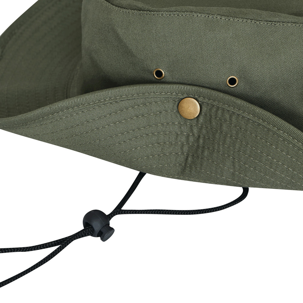 Safarihoed SUNDALE: rand kan met een drukknoop aan de zijkanten omhoog worden geklapt, 4 ventilatiegaatjes van metaal, kinband met kunststof stopper om aan de hoofdomtrek aan te passen