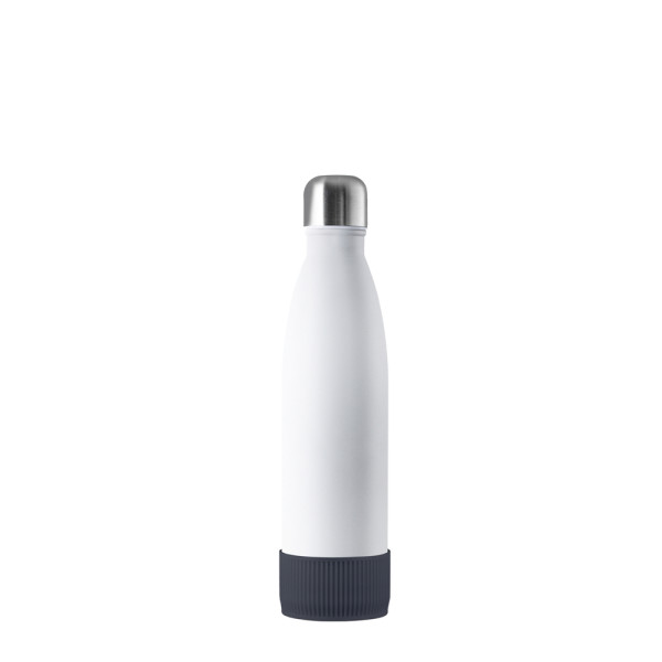 Voor warme of koude dranken, onze dubbelwandige roestvrijstalen fles met een trendy en functioneel design maakt indruk. Door de dubbele wand met vacuum blijven uw drankjes lang koud of warm. De drinkfles kan besteld worden met een edele matzwarte, met een witte poedercoating of natuurlijk met een zilverglans. De fles heeft een inhoud van 500 ml. Trek absoluut de aandacht met uw logo op de trendy drinkfles.