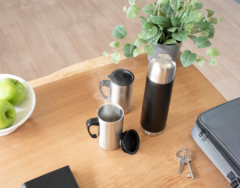 Thermosset bestaande uit een dubbelwandige roestvrijstalen vacuüm thermosfles (500 ml), en 2 roestvrijstalen thermosbekers (260 ml), met een kunststof deksel, in een nylon etui met draagband.