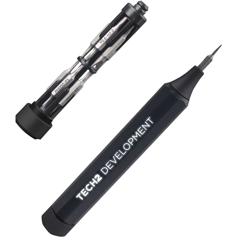 Precisie schroevendraaierset in aluminium, voorzien van daarin verborgen 10-dubbelkoppige bits. De verschillende bits worden met een magnetische functie aan de schroevendraaierpen bevestigd en zijn geschikt voor de meeste technische apparaten. Dit product is aanpasbaar met lasergraveren. Geleverd in een geschenkverpakking van gerecycled papier.