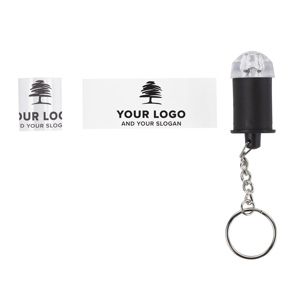 Sleutelhanger met kunststof concertlampje, incl. batterijen. Bedrukking op de bijgesloten wikkel.meer