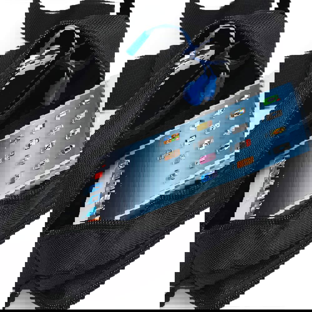Polyester 600D. Ring voor de kabeltjes van een headset. Aanpasbare heupriem. Sluithaak voor sleutels. Achterzak met rits. Binnenzak van mesh.