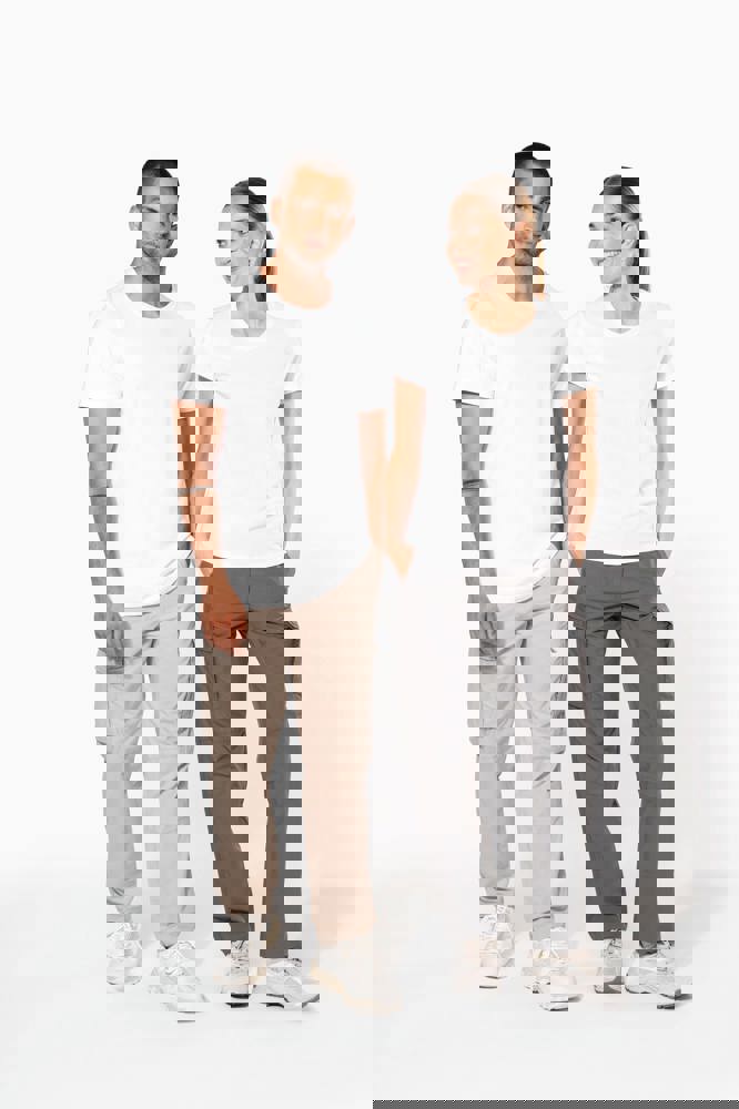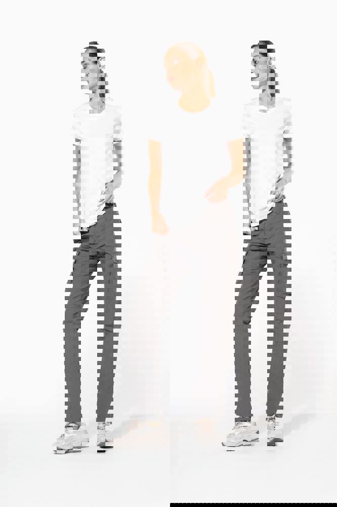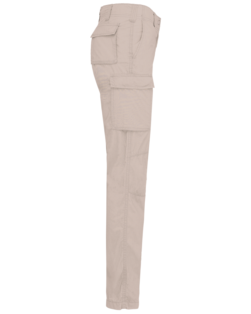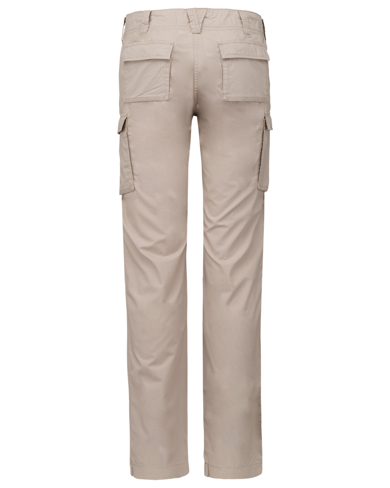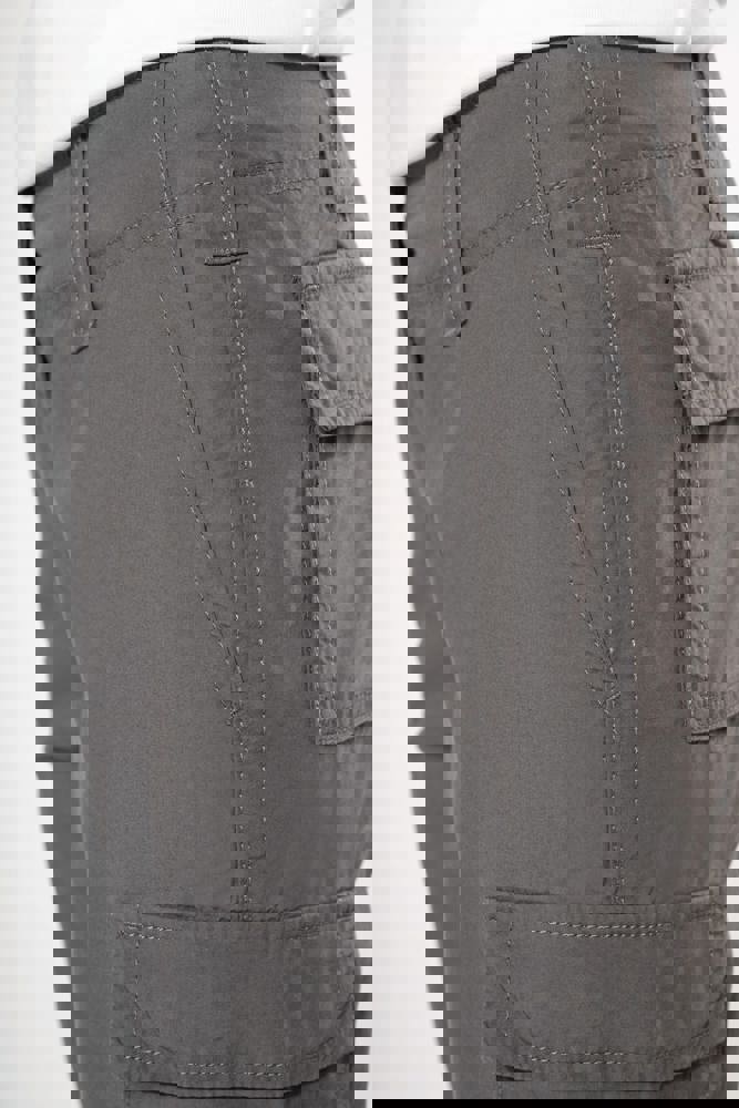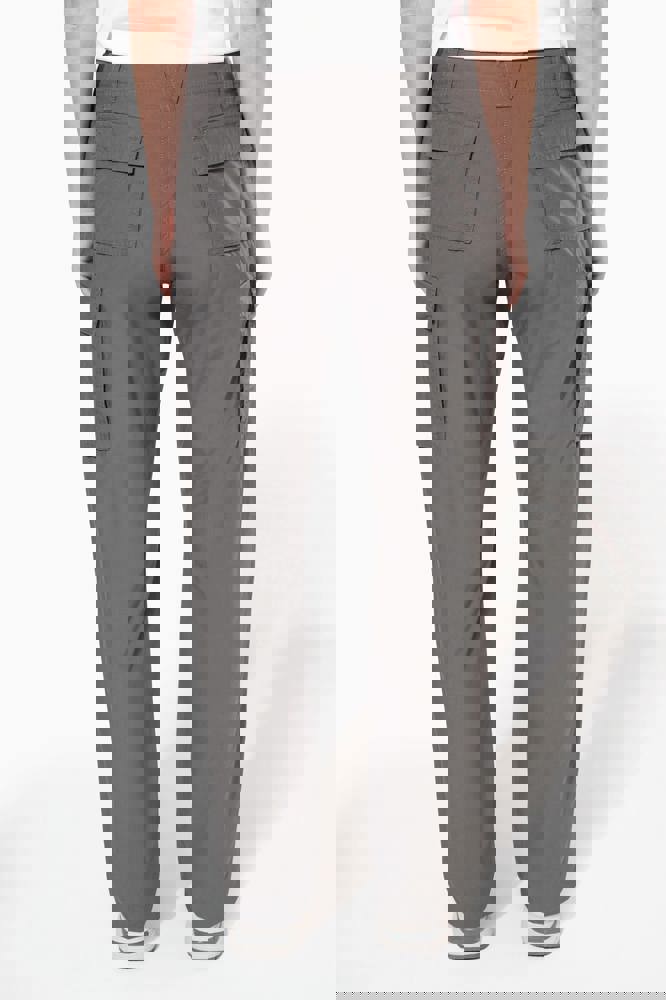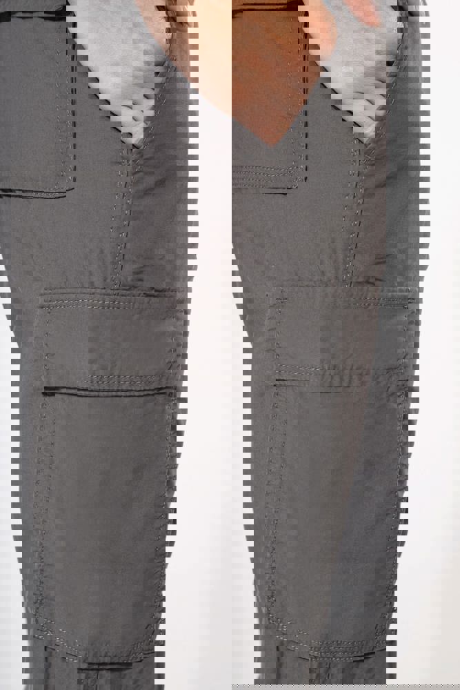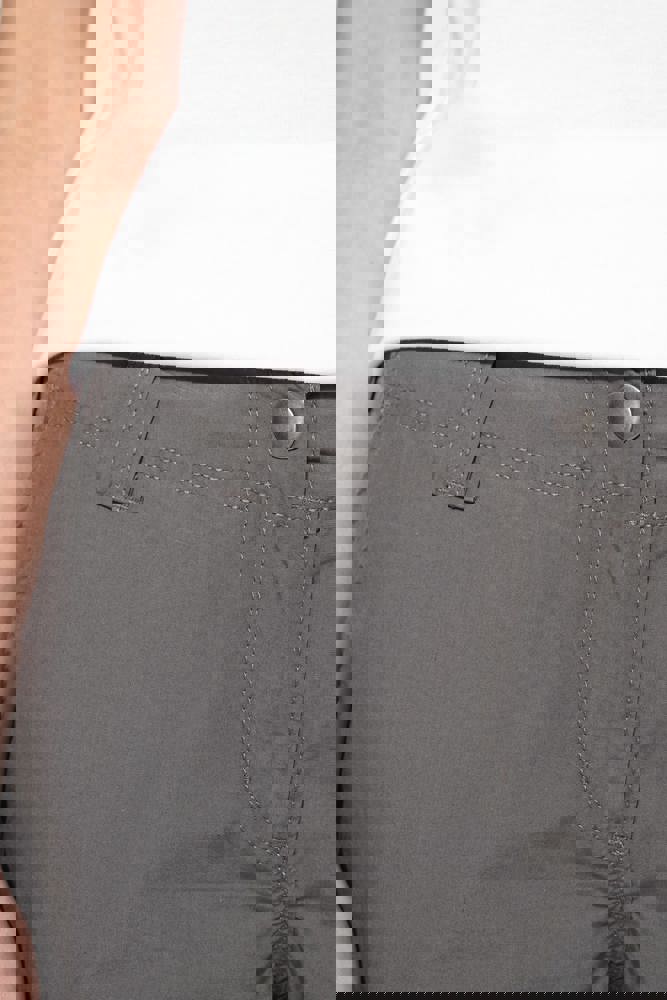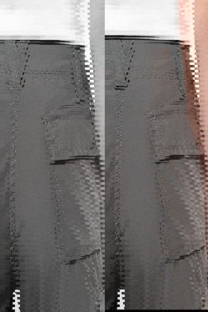 100% katoen. Verwassen popelinestof voor een soepele en comfortabele look. Contrasterende riembinnenzijde met aanrijgkoordjes. Ritssluiting met drukknoop. 2 Italiaanse zakken aan de voorkant, waarvan één met 1 muntzak. 2 plooizakken met klep en drukknoop aan de achterkant en opzij. Inzetstukken op de knieën.