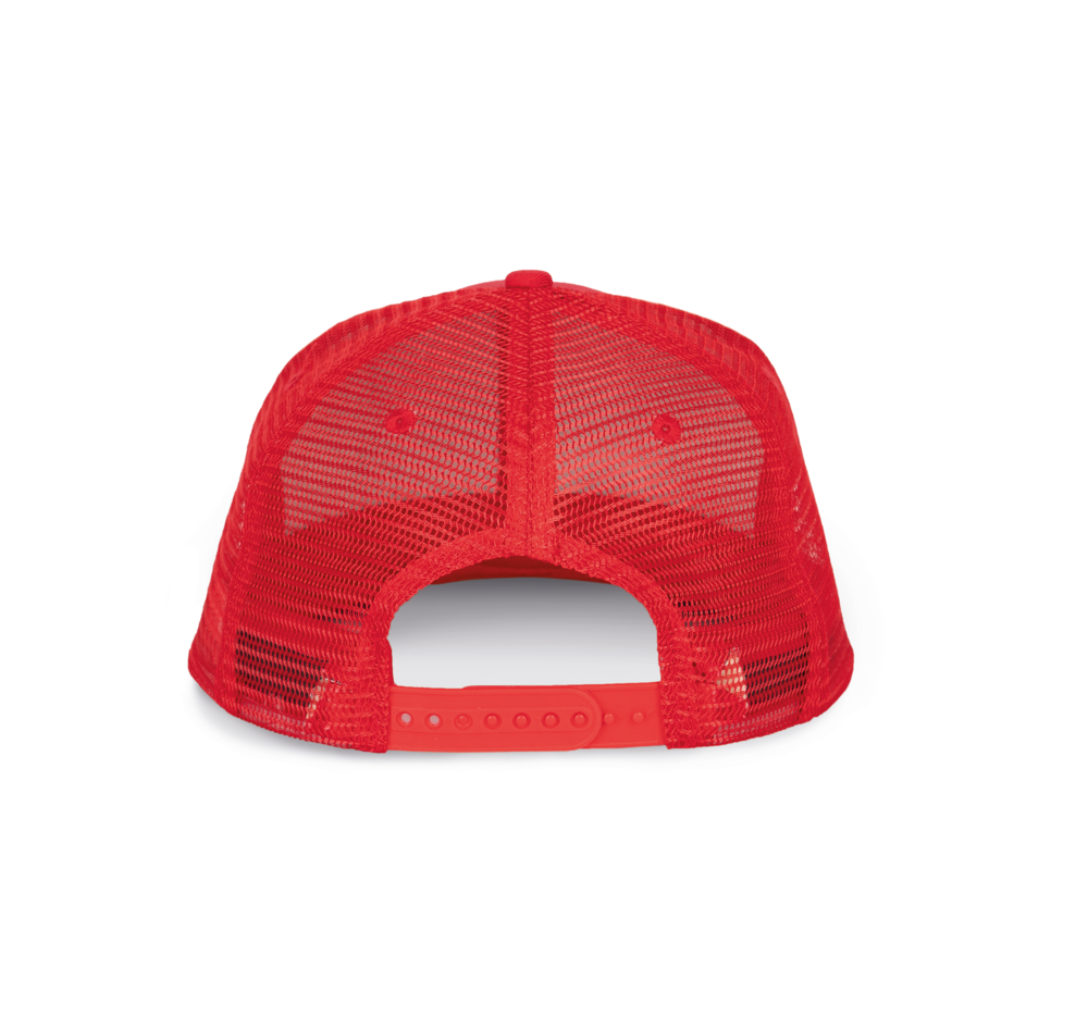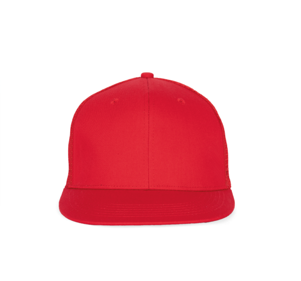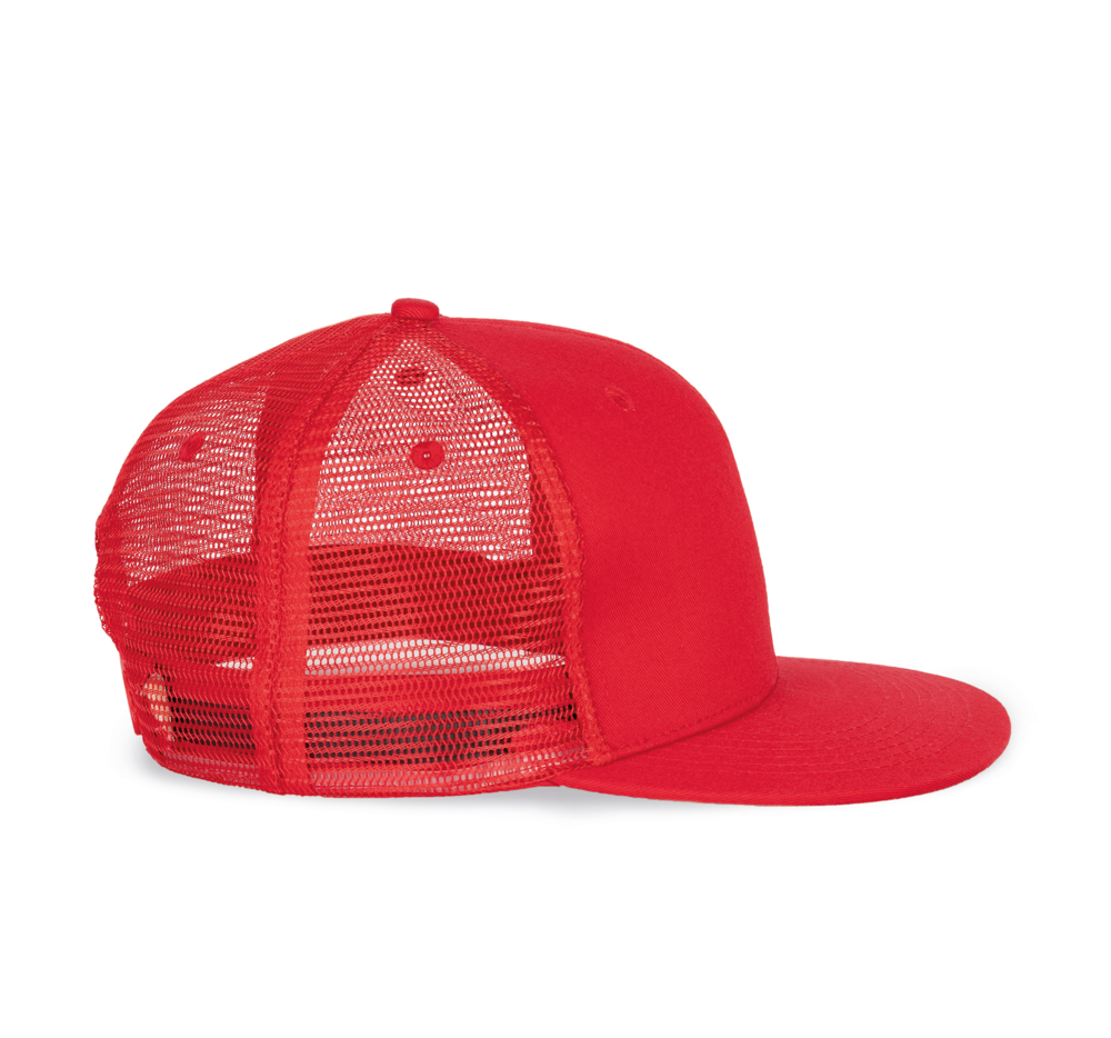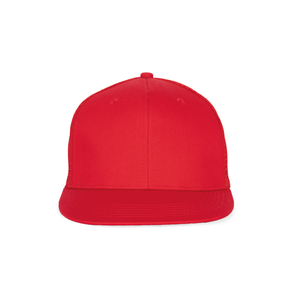 100% katoenen cap met 100% polyester mesh. 6 verstevigde panelen met platte klep. Katoenen zweetband. Verstelbare plastic sluiting.