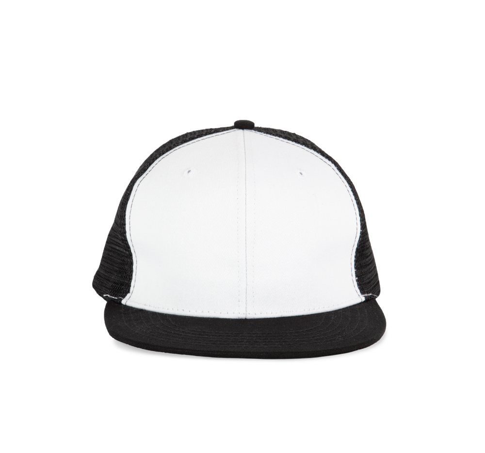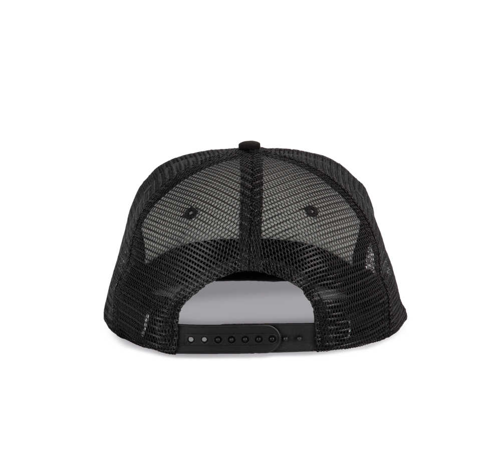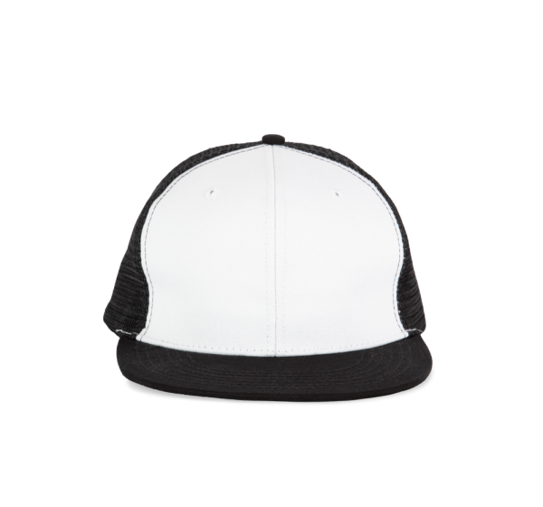 100% katoenen cap met 100% polyester mesh. 6 verstevigde panelen met platte klep. Katoenen zweetband. Verstelbare plastic sluiting.