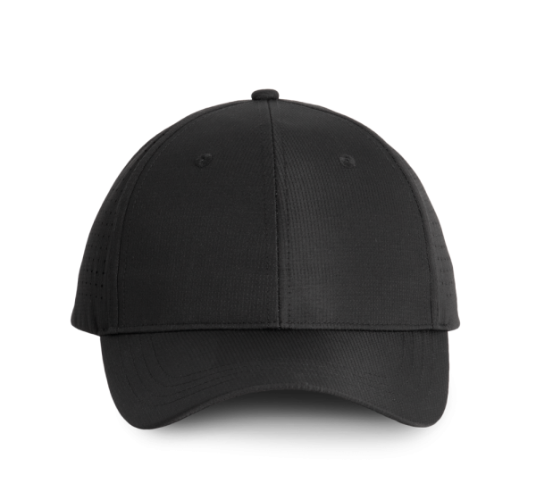 100% polyester. Pet met 6 panelen. De 4 achterste panelen kregen gelaserde microgaatjes om een optimale ventilatie te verzekeren. De zonneklep is afgerond. Deze pet kreeg een regelbare sluiting met klittenband.