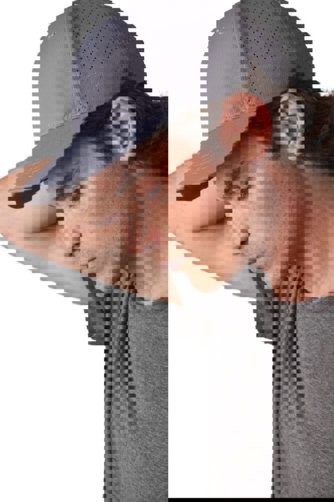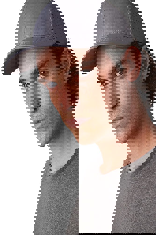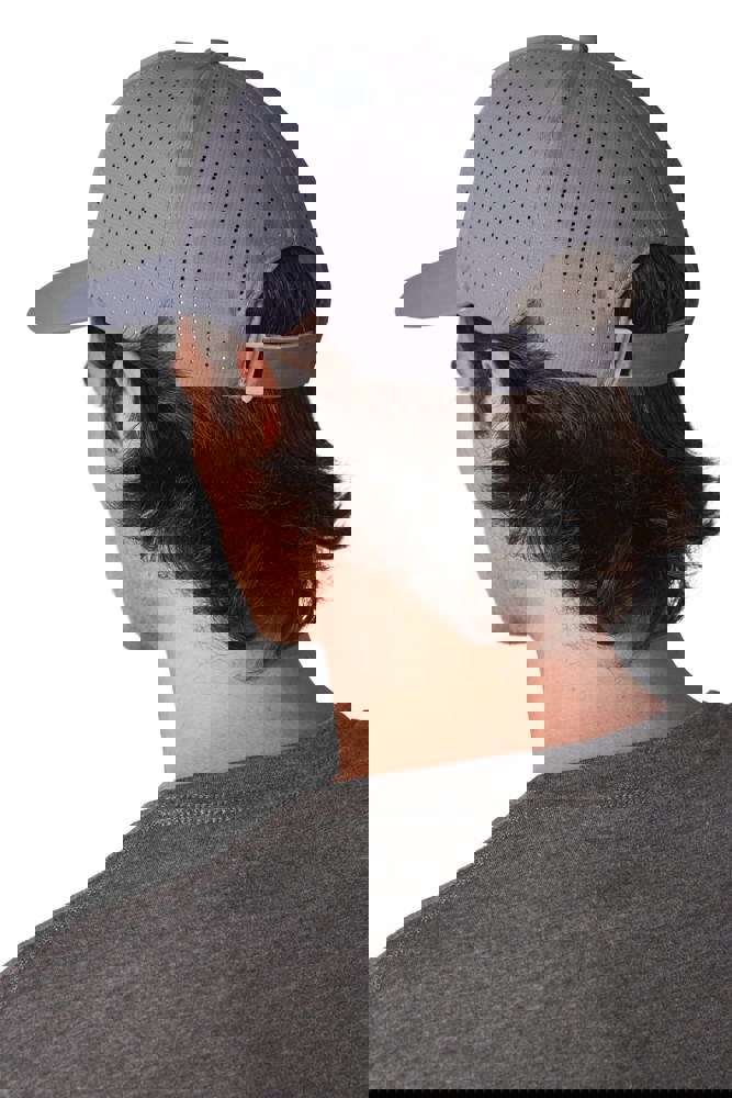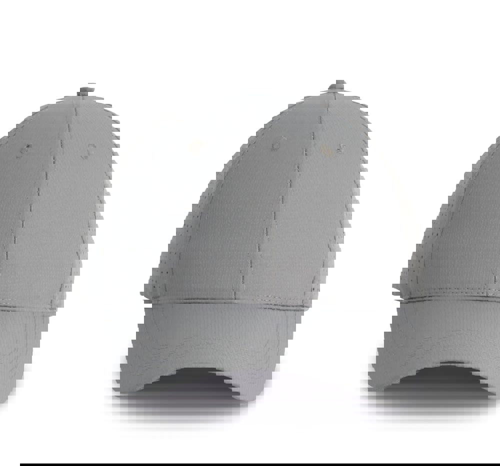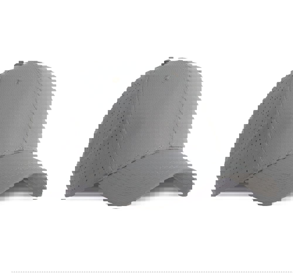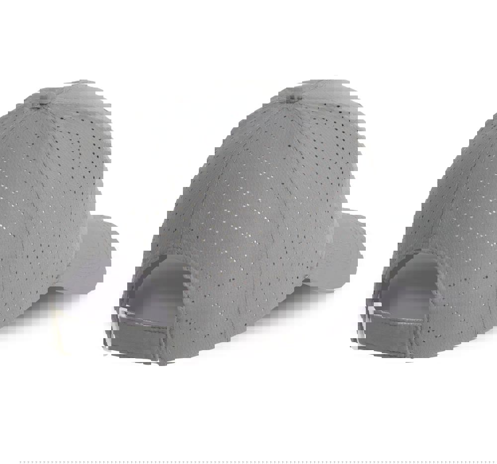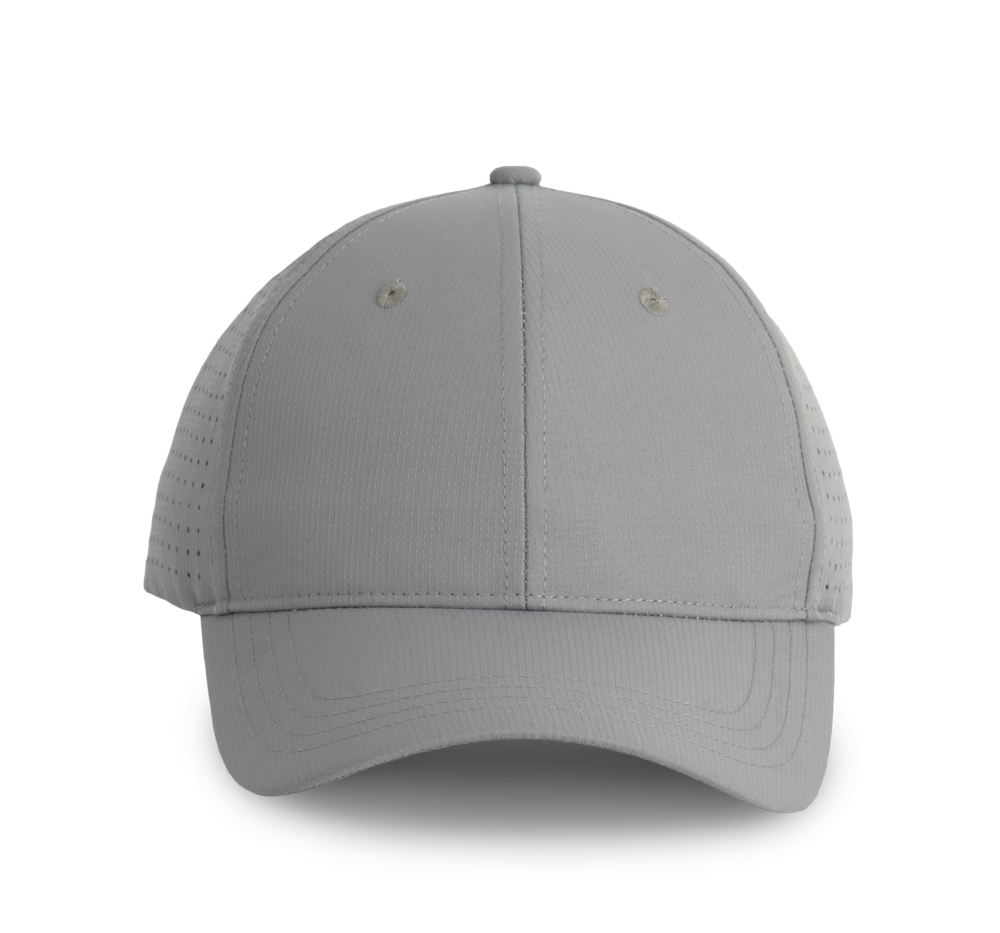 100% polyester. Pet met 6 panelen. De 4 achterste panelen kregen gelaserde microgaatjes om een optimale ventilatie te verzekeren. De zonneklep is afgerond. Deze pet kreeg een regelbare sluiting met klittenband.
