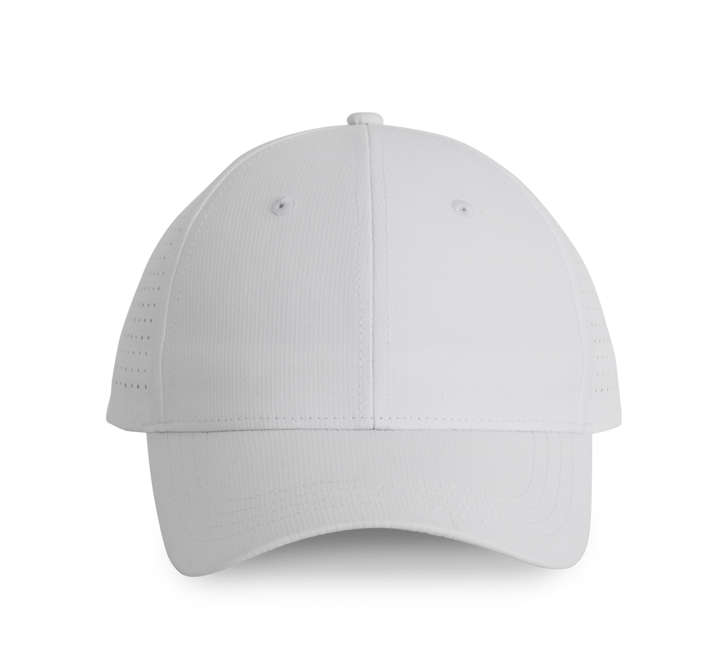 100% polyester. Pet met 6 panelen. De 4 achterste panelen kregen gelaserde microgaatjes om een optimale ventilatie te verzekeren. De zonneklep is afgerond. Deze pet kreeg een regelbare sluiting met klittenband.