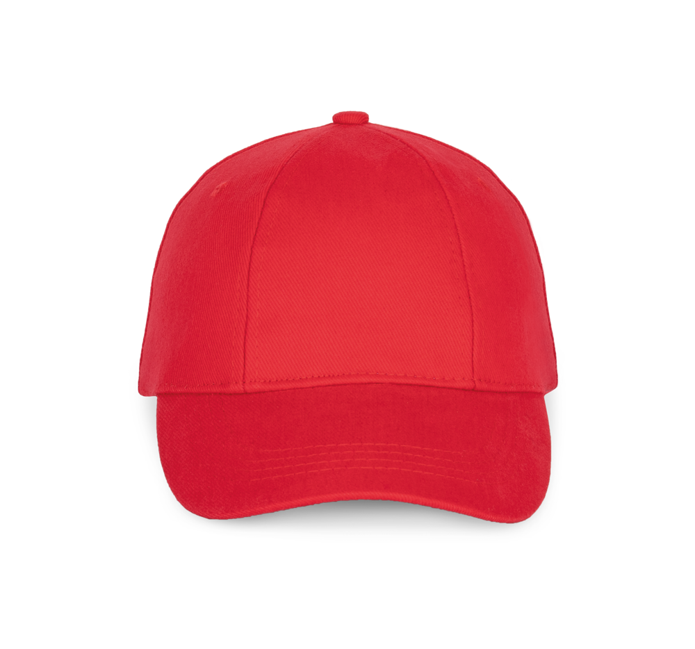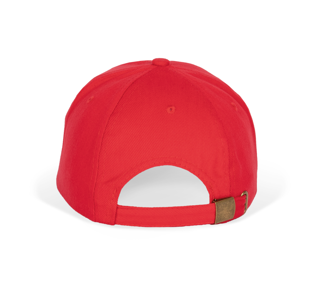 100% geborstelde zware katoen. 6 verstevigde panelen. Voorpaneel eenvoudig te bedrukken. Verstelbare metalen gesp-sluiting.