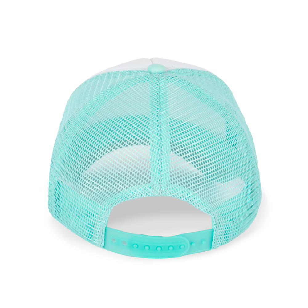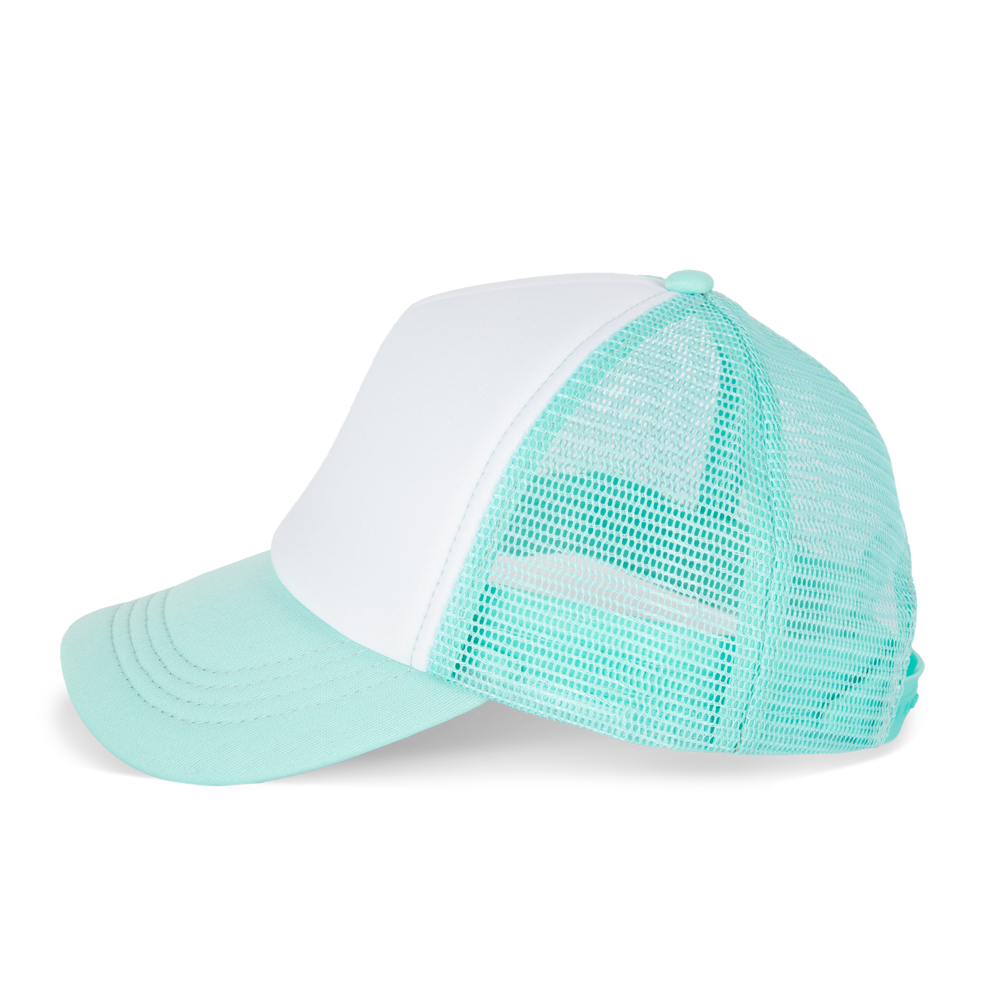 100% polyester met mesh van polyester aan de achterkant. 5 panelen. Eenvoudige aanpassing van het frontpaneel. Verstelbare druksluiting van plastic. Hoofdomvang: 53 cm.