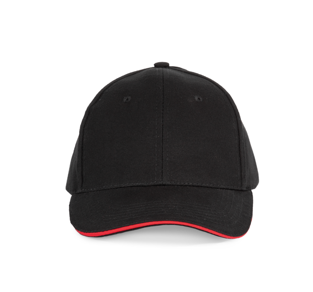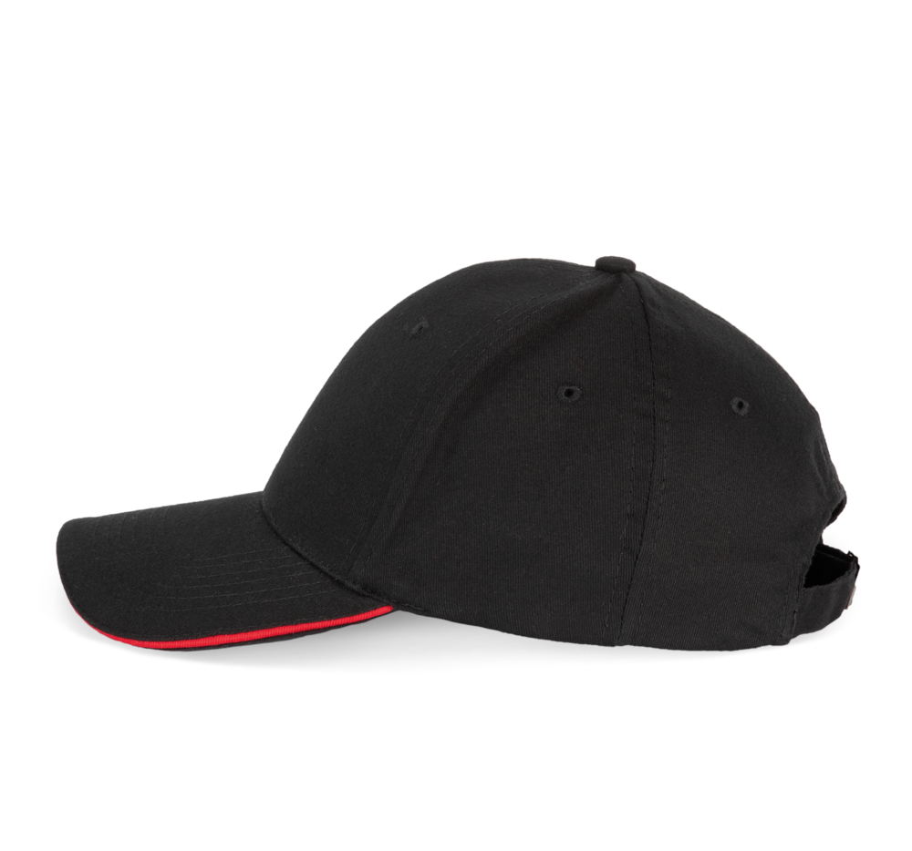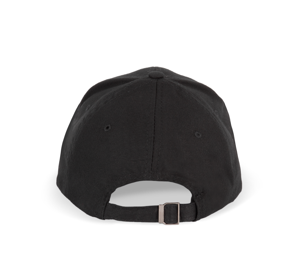 100% twillkatoen. 6 panelen. Contrasterende bies. Verstelbare sluiting aan de achterkant met metalen gesp.