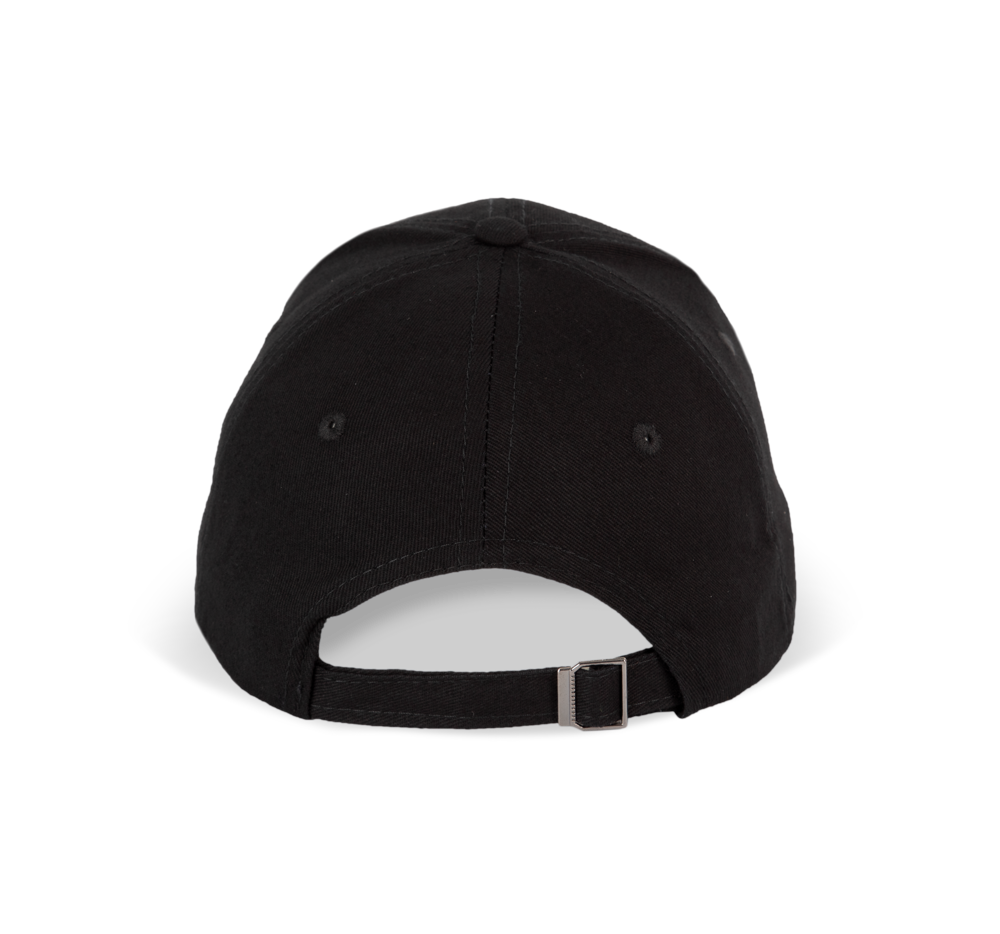 100% twillkatoen. 6 panelen. Contrasterende bies. Verstelbare sluiting aan de achterkant met metalen gesp.