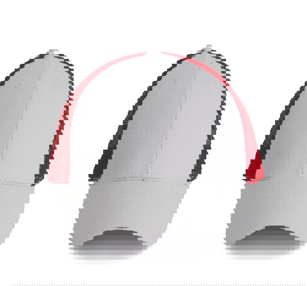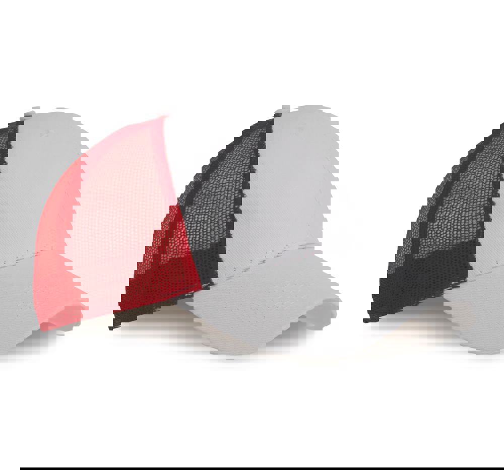100% katoen / 100% polyester. Pet Trucker met 6 panelen.De voorste panelen en de afgeronde zonneklep zijn gemaakt van katoen, de mesh van polyester. Met een verstelbare druksluiting van plastic.