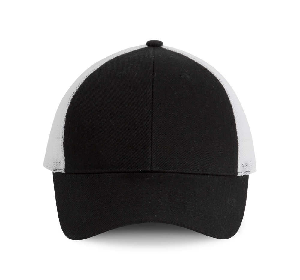100% katoen / 100% polyester. Pet Trucker met 6 panelen.De voorste panelen en de afgeronde zonneklep zijn gemaakt van katoen, de mesh van polyester. Met een verstelbare druksluiting van plastic.