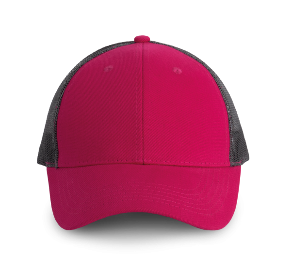 100% katoen / 100% polyester. Pet Trucker met 6 panelen.De voorste panelen en de afgeronde zonneklep zijn gemaakt van katoen, de mesh van polyester. Met een verstelbare druksluiting van plastic.