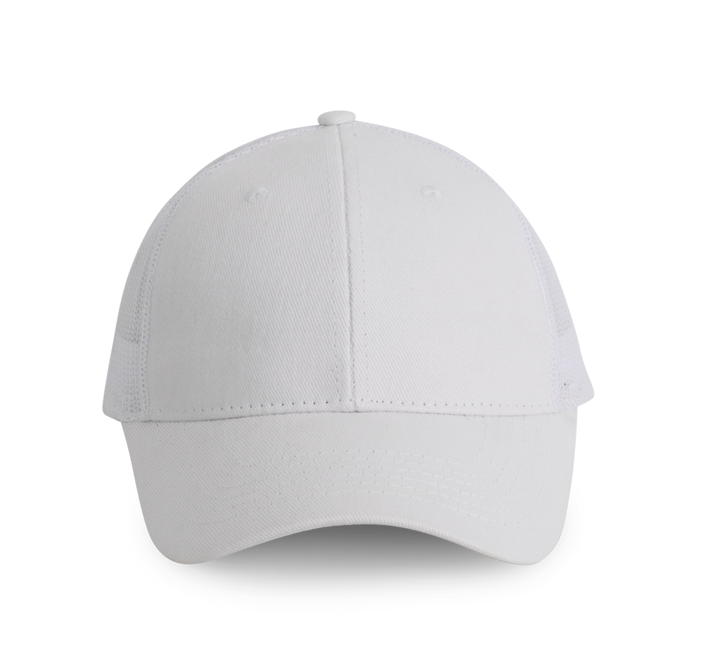 100% katoen / 100% polyester. Pet Trucker met 6 panelen.De voorste panelen en de afgeronde zonneklep zijn gemaakt van katoen, de mesh van polyester. Met een verstelbare druksluiting van plastic.
