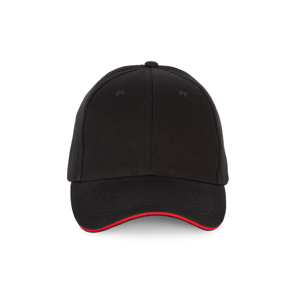 100% katoen. Pet met 6 panelen en contrasterende bies. Verstelbare sluiting met metalen gesp en zelfblokkerende lus.