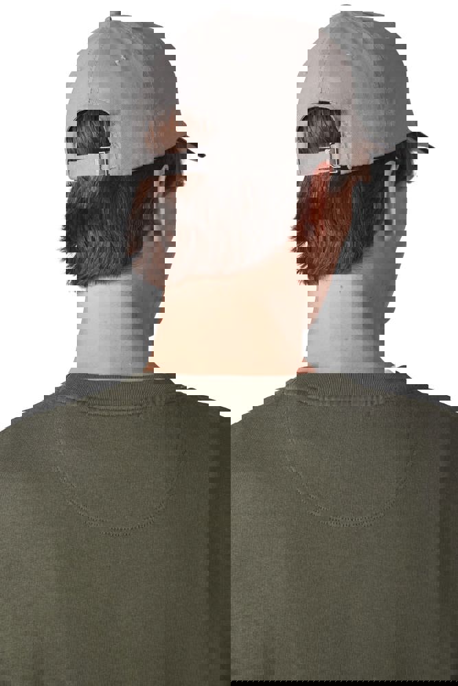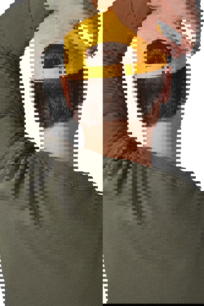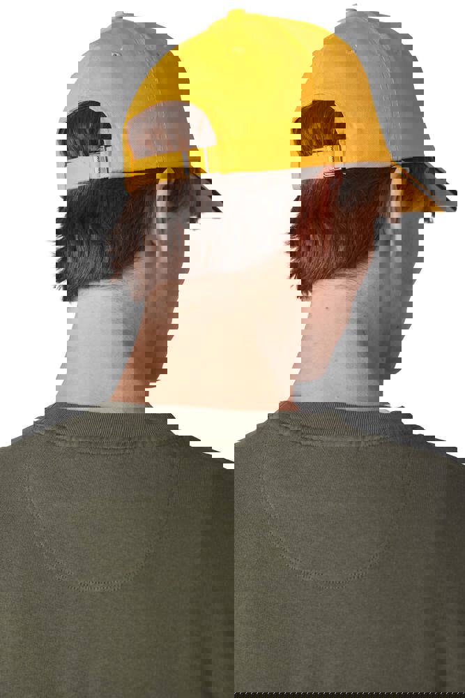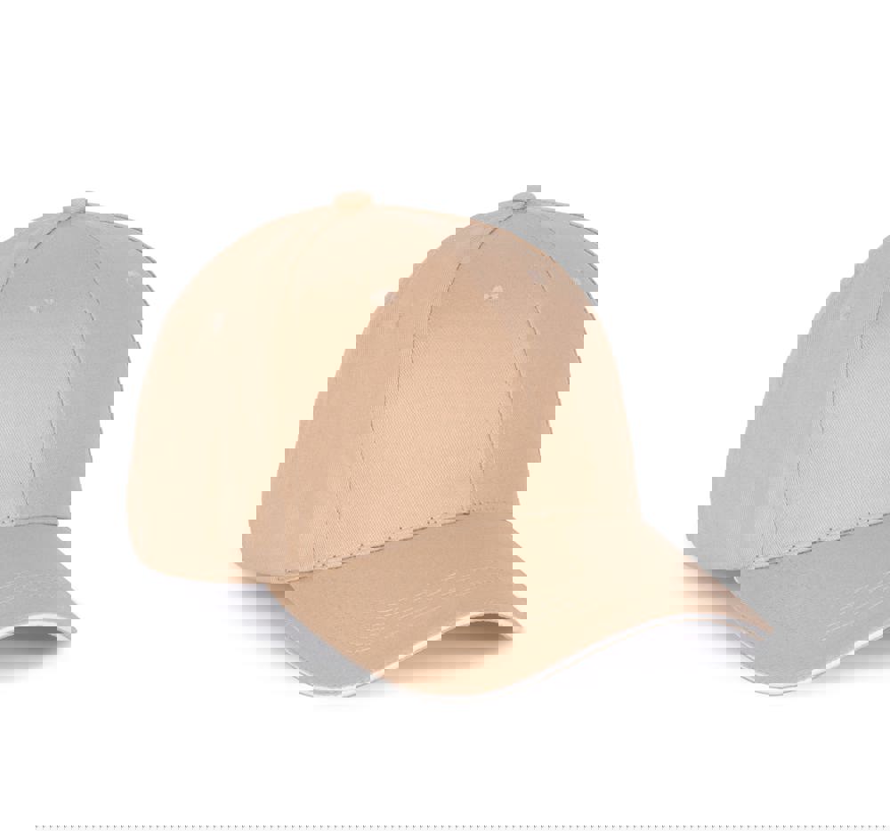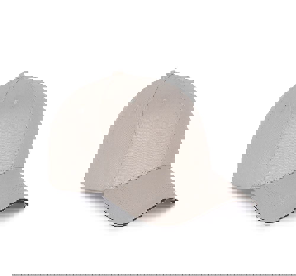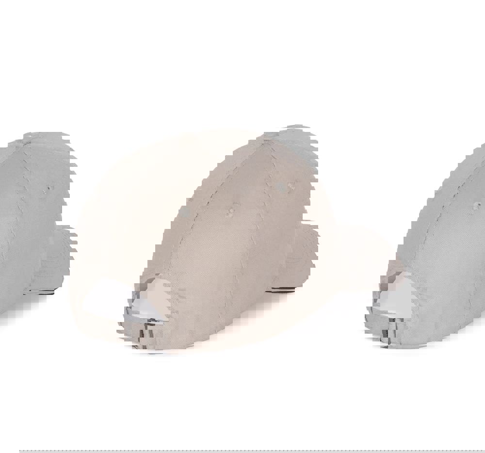 100% katoen. Pet met 6 panelen en contrasterende bies. Verstelbare sluiting met metalen gesp en zelfblokkerende lus.