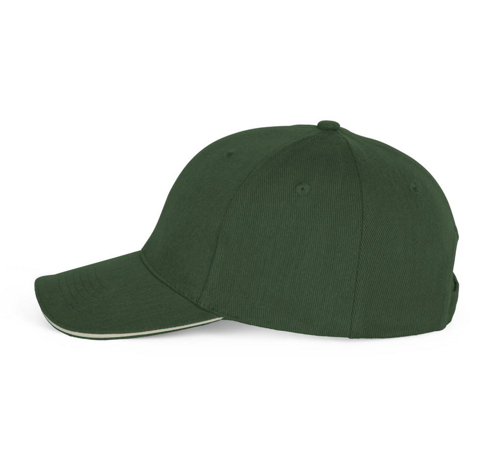 100% katoen. Pet met 6 panelen en contrasterende bies. Verstelbare sluiting met metalen gesp en zelfblokkerende lus.