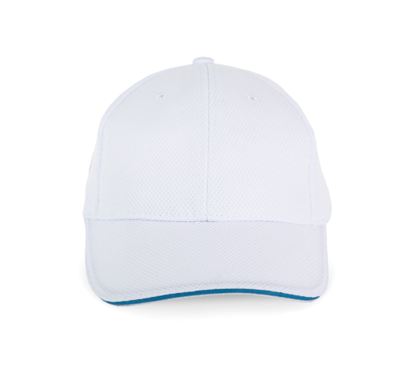 100% polyester piqué. Luchtgaatjes. Rand van de klep in contrastkleur. Afgezet met een band van...meer