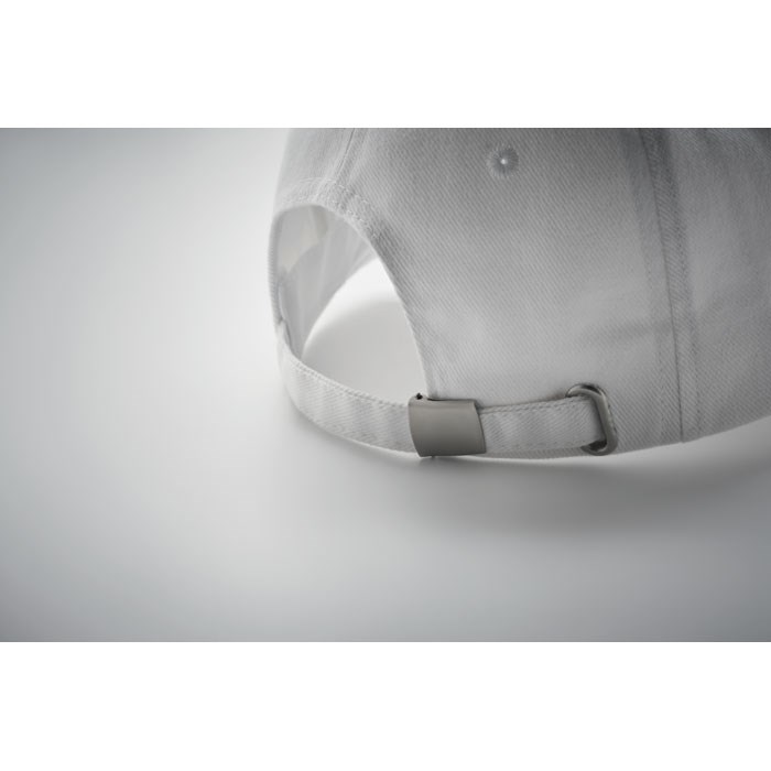 5 panelen baseballpet in zwaar geborsteld twill katoen 260 gr/m² met zilverkleurige stalen gesp. 4 geborduurde oogjes in bijpassende kleur. Maat 7 1/4.