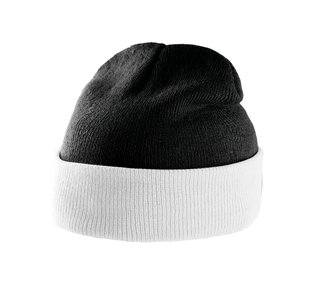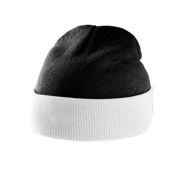 100% acryl. Gebreide muts met omslag in contrastkleur.