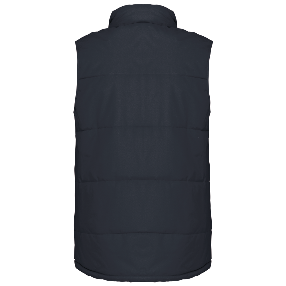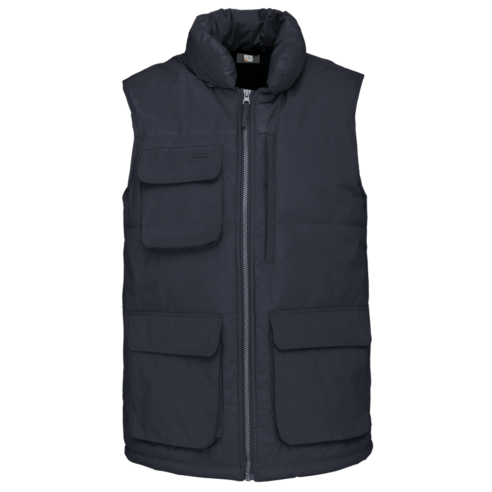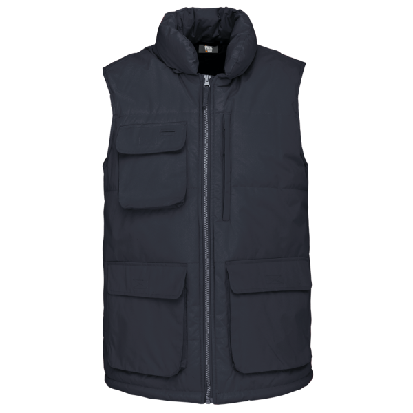 100% polyester. Microvezel PVC inductie 1500 mm waterdicht. Voering met 100% polyesterwatten. 4 voorzakken: 2 zakken aan de onderzijde met overslag en klittenbandsluiting, 1 borstzak+ gaatje voor draadje van de koptelefoon, en 1 borstzakje met ristsluiting. 1 binnenzak met rits. Gewatteerde kraag met ruimte voor het draadje van de koptelefoon. Aanrijgkoord aan de onderkant van de bodywarmer. Plastic zilverkleurige ritssluiting. Drukkersrits.