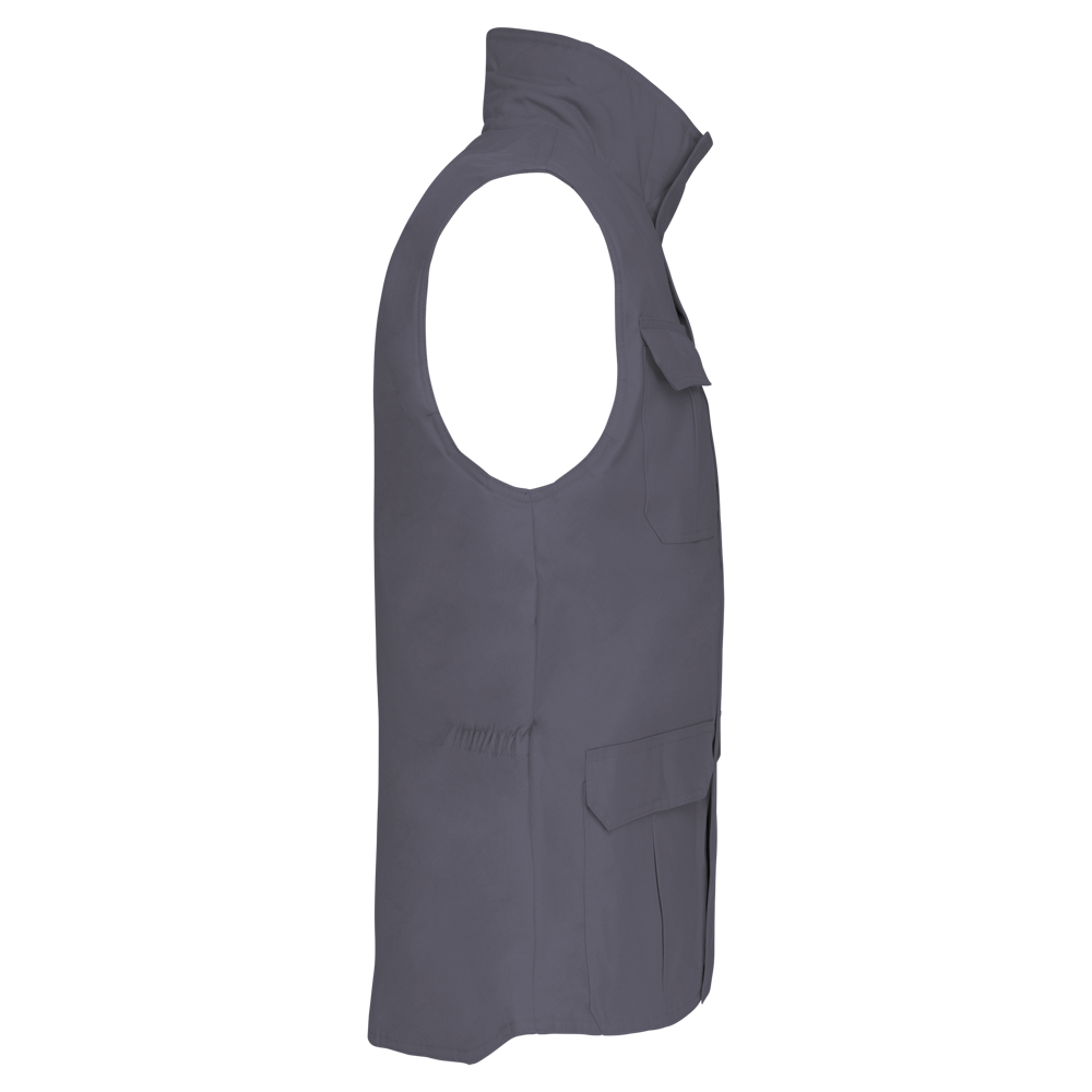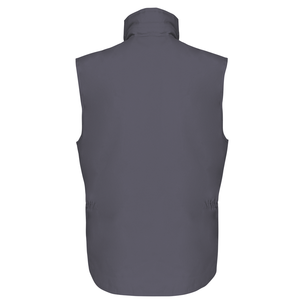 100 % polyester. Buitenkant: 100% oxford polyester met PVC inductie. Gewatteerde voering met 100% polyesterwatten. Ritssluiting verborgen onder een lijst met drukknopen. 4 buitenzakken (3 met overslag en 1 met rits). Elastische armsgaten en regelbaar met een stopper. 2 binnenzakken (1 met rits en 1 gsmzakje). Drukkersrits.