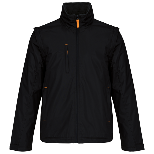 100% polyester met PVC inductie. 100% polyester fleecevoering. De voering van de mouwen is in 100% polyester + 100% polyesterwatten. Zachte stof. Volledige ritssluiting. 3 zakken met ritssluiting. Afritsbare mouwen. Verstelbare mouwuiteinden. Contrasterende ritstrekker, nektape en stopstiksels. 3 binnenzakken (2 met rits en 1 gsmzakje). Aanrijgkoord aan de binnenkant de jas. Capuchon verwerkt in de kraag. Drukkersrits.