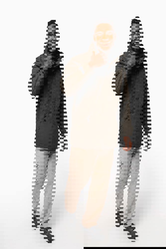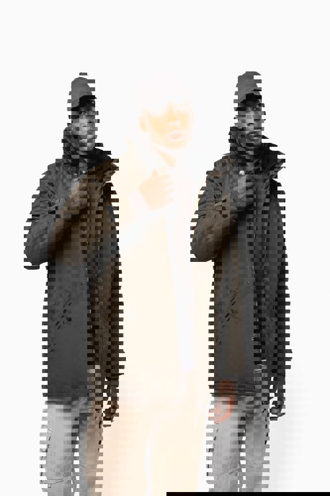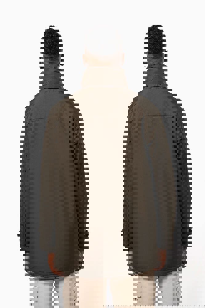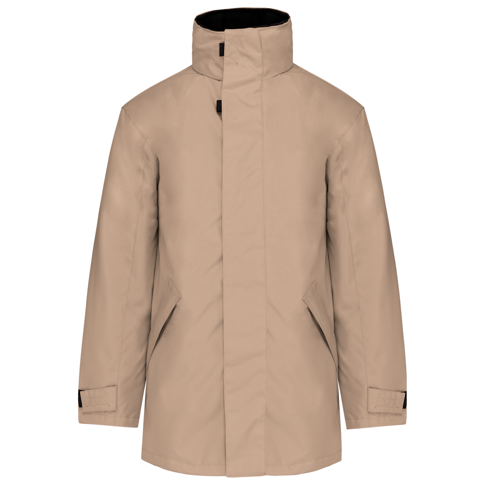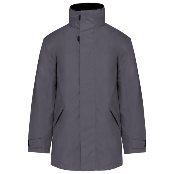 Buitenkant: 100% oxford polyester. Binnenkant: gewatteerd polyester. 2 voorzakken met rits. 2 binnenzakken waarvan 1 voor de GSM. Capuchon verborgen in de kraag. Kraag met fleecevoering. Drukkersrits. Ritssluiting verborgen onder een lijst met drukknopen en klittenband. Verstelbare mouwuiteinden met klittenband.