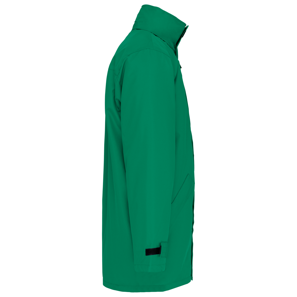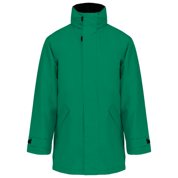Buitenkant: 100% oxford polyester. Binnenkant: gewatteerd polyester. 2 voorzakken met rits. 2 binnenzakken waarvan 1 voor de GSM. Capuchon verborgen in de kraag. Kraag met fleecevoering. Drukkersrits. Ritssluiting verborgen onder een lijst met drukknopen en klittenband. Verstelbare mouwuiteinden met klittenband.