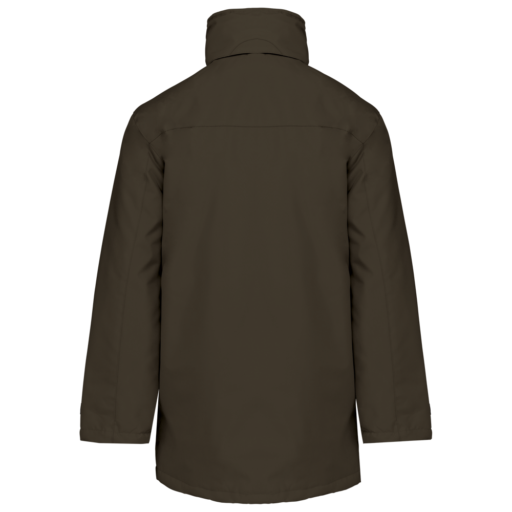 Buitenkant: 100% oxford polyester. Binnenkant: gewatteerd polyester. 2 voorzakken met rits. 2 binnenzakken waarvan 1 voor de GSM. Capuchon verborgen in de kraag. Kraag met fleecevoering. Drukkersrits. Ritssluiting verborgen onder een lijst met drukknopen en klittenband. Verstelbare mouwuiteinden met klittenband.