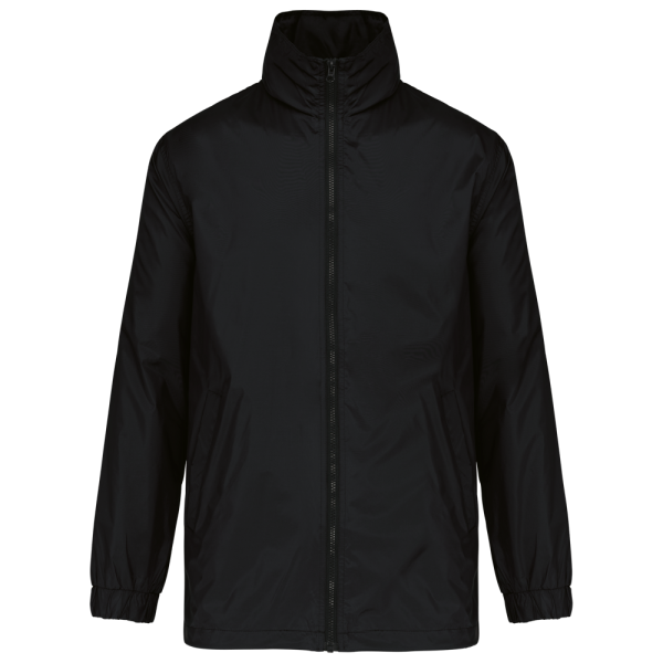 100% polyamide 210 T met acryl inductie. Grijze binnenvoering van 100% polyester single jersey. Ritssluiting. 1 binnenzak en 2 buitenzakken. Aanrijgkoord met stoppers onderaan. Capuchon in de kraag met elastisch koord. Drukkersrits.