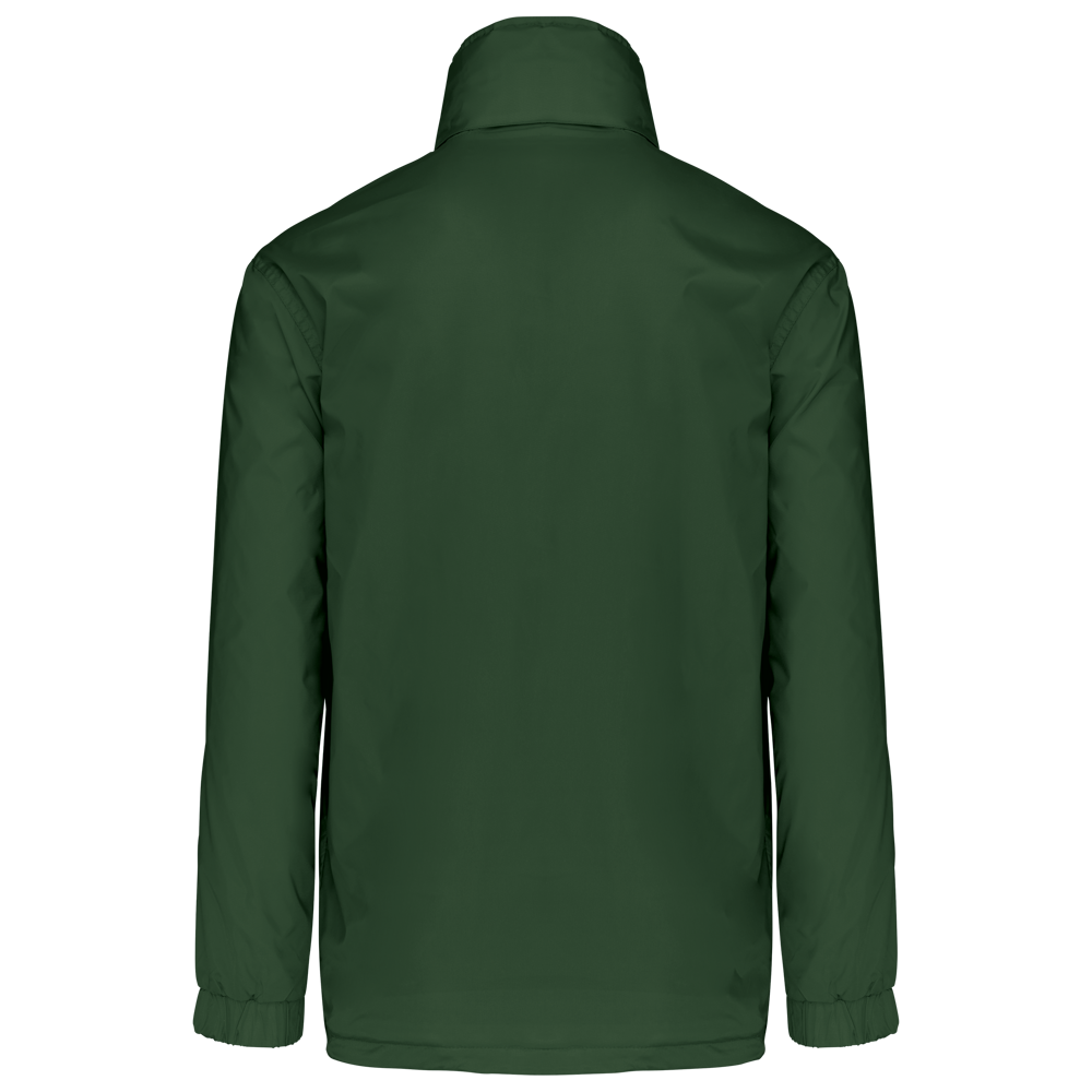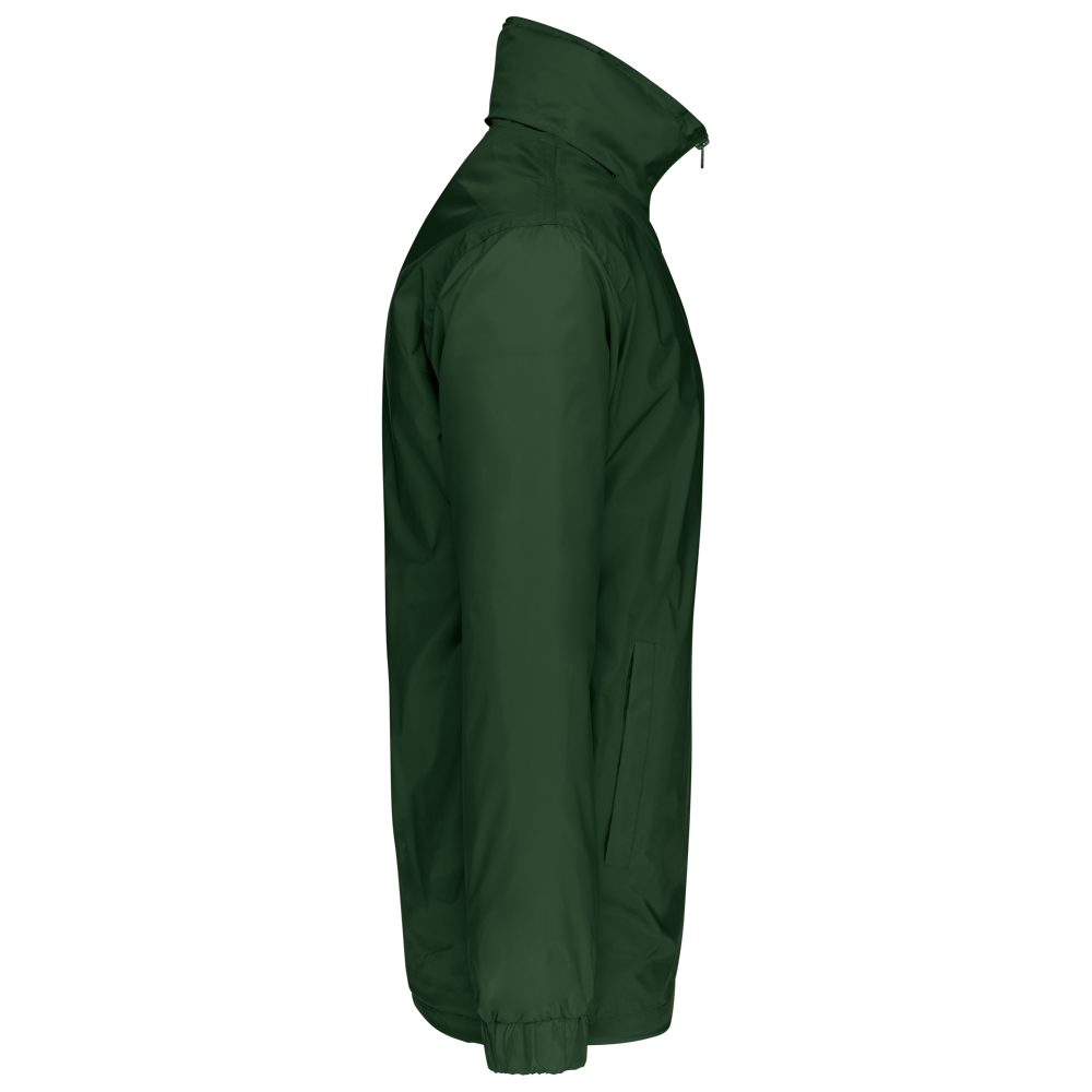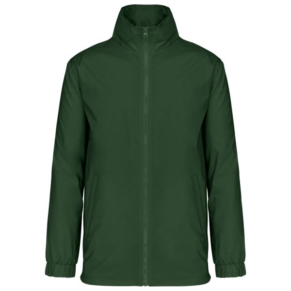 100% polyamide 210 T met acryl inductie. Grijze binnenvoering van 100% polyester single jersey. Ritssluiting. 1 binnenzak en 2 buitenzakken. Aanrijgkoord met stoppers onderaan. Capuchon in de kraag met elastisch koord. Drukkersrits.