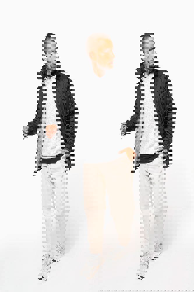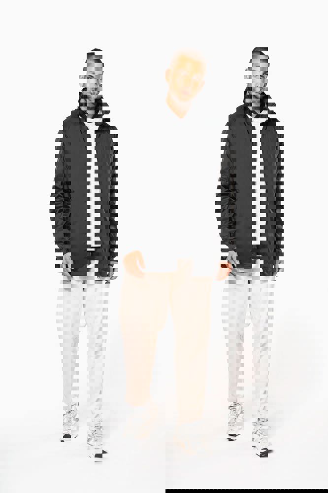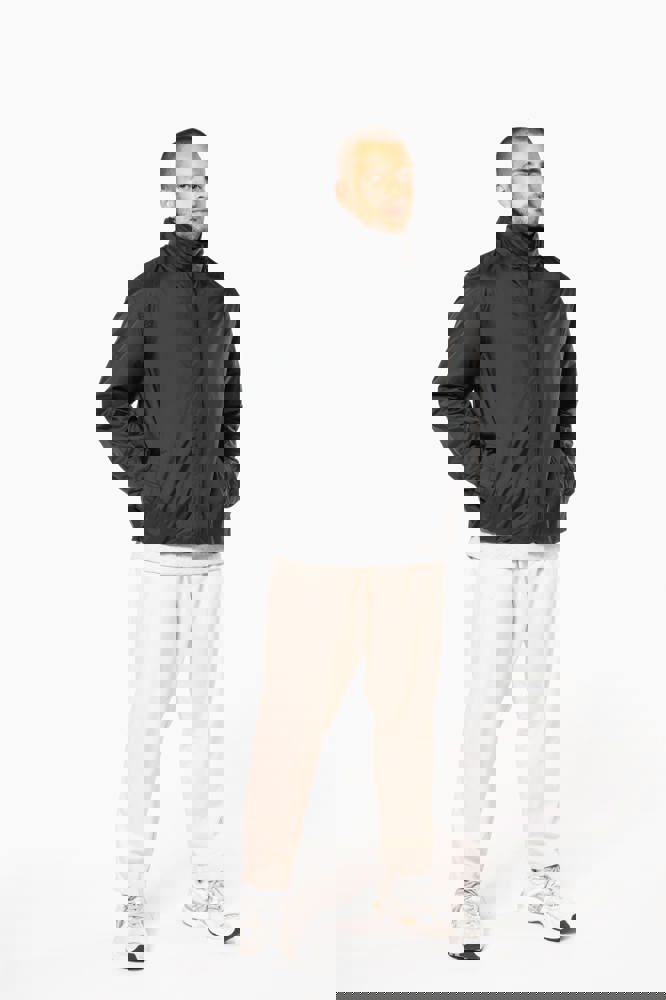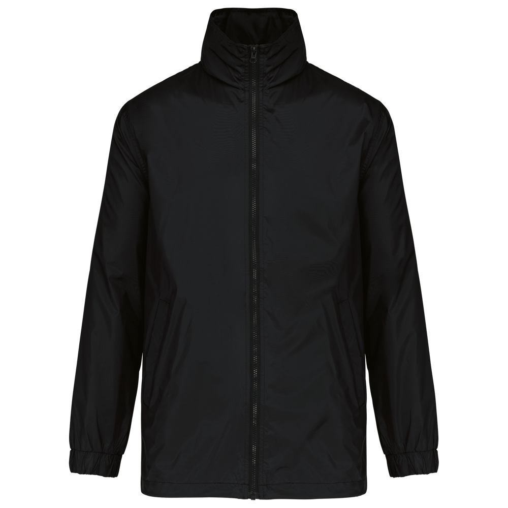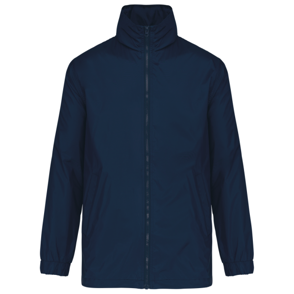 100% polyamide 210 T met acryl inductie. Grijze binnenvoering van 100% polyester single jersey. Ritssluiting. 1 binnenzak en 2 buitenzakken. Aanrijgkoord met stoppers onderaan. Capuchon in de kraag met elastisch koord. Drukkersrits.