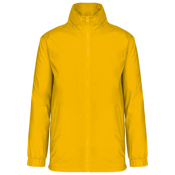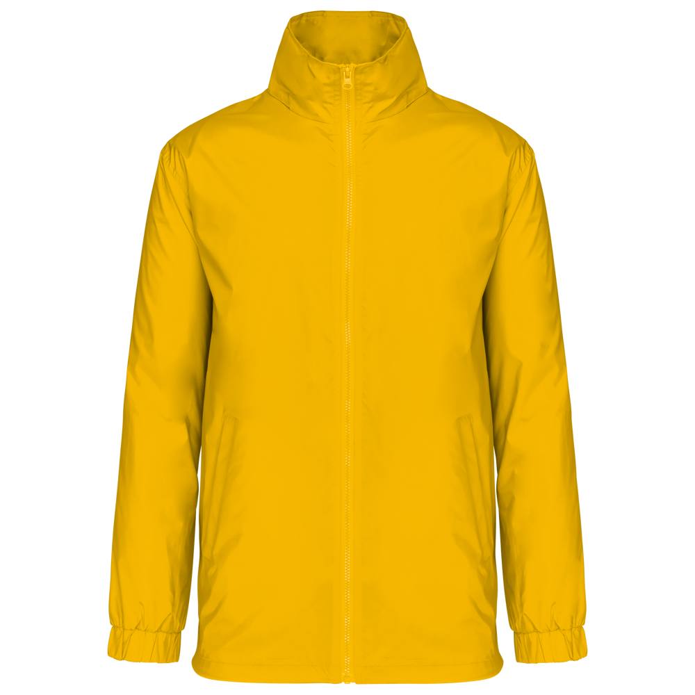 100% polyamide 210 T met acryl inductie. Grijze binnenvoering van 100% polyester single jersey. Ritssluiting. 1 binnenzak en 2 buitenzakken. Aanrijgkoord met stoppers onderaan. Capuchon in de kraag met elastisch koord. Drukkersrits.