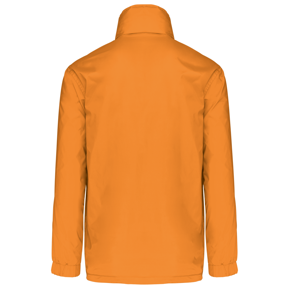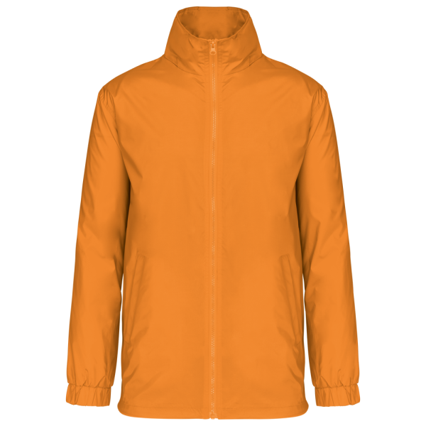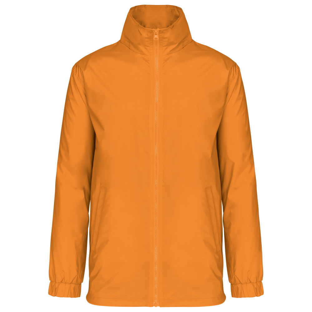 100% polyamide 210 T met acryl inductie. Grijze binnenvoering van 100% polyester single jersey. Ritssluiting. 1 binnenzak en 2 buitenzakken. Aanrijgkoord met stoppers onderaan. Capuchon in de kraag met elastisch koord. Drukkersrits.