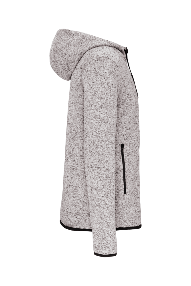 Geborstelde binnentricot 100% polyester. 2 contrasterende ritszakken aan de voorkant en 1 contrasterende borstzak met rits. Capuchon met contrasterende jerseyvoering van 100% katoen met platte, contrasterende aanrijgkoordjes. Mouwuiteinden en onderkant kledingstuk, afgewerkt met contrasterende, elastische biaisband. Overlocksteek op de inzetstukken.