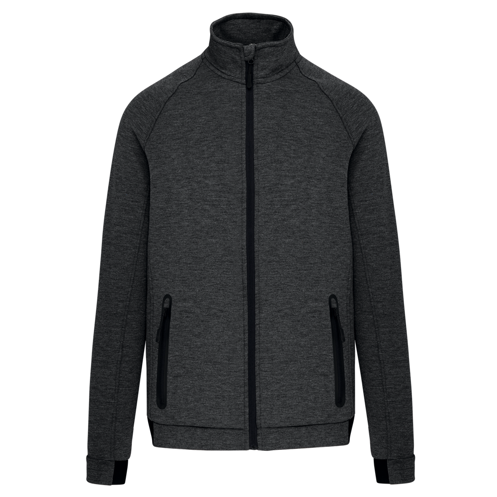 94% polyester / 6% elasthan (79% polyester / 15% viscose / 6% elasthan voor Heather kleur). Hele comfortabele stof. Ritssluiting. 2 ritszakken met warmtegelaste afwerking aan de voorkant. Nauwsluitende boorden aan de mouwen en onderaan, met een elastisch stuk Black op alle kleuren en Dark Grey op de Ash Heather (sluitingen ook). Ideaal om te dragen op trainingsbroek PA1008 in een total Urban Apparel stijl.