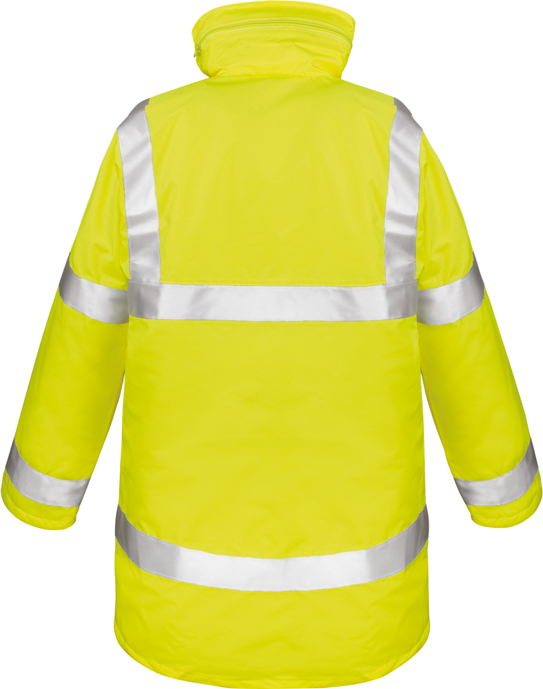 Buitenkant: 100% polyester oxford met PU coating. Wattering van 100% polyesterwatten. Voering van 190T polyester. 3000mm waterdicht. Winddicht. EN ISO 20471:2013 Class 3. GO/RT 3279 Issue 8:2013 Class 3 (orange only). Getapete naden. Capuchon in de kraag met aanrijgkoordjes. Eyelets onder de armen. Volledige ritssluiting met stormoverslag en drukknopen. 2 ruime voorzakken, 1 binnenzak en 1 zak voor gsm. 3M™ Scotchlite™ reflecterende tape genaaid 50mm. Drukkersrits.