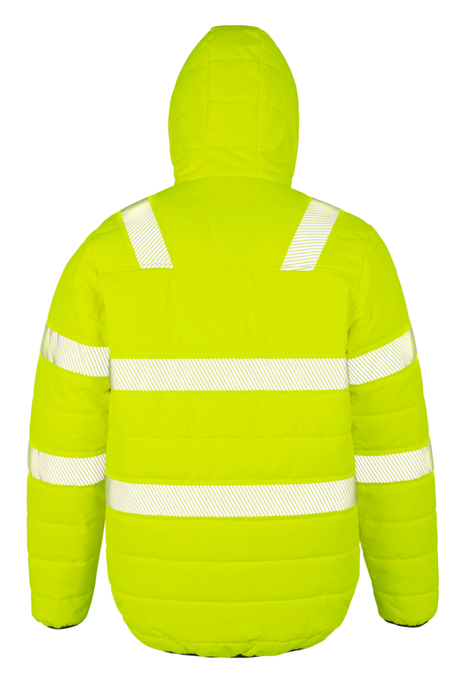 100% polyester. 100% gerecycled polyester. Gerecyclede gewatteerde ripstop veiligheidsjas. Bestand tegen schuren met REPREVE®. Vulling van gerecycled polyester 200 g/m² REPREVE®. Vezels gemaakt van gerecyclede petflessen. YKK-ritssluiting aan de voorkant met kinbescherming en schuiver. Tailleband, mouwuiteinden en capuchon met elastische bies. Langer achterpand. Gedrukte reflecterende stroken op het lichaam, de schouders en de mouwen. Zijzakken met rits. Gewatteerde capuchon. Binnenzak. Ophanglus. Norm High Viz: EN ISO 20471: 2013+A1: 2016 Klasse 2 (RIS-3279-TOM Klasse 2 (enkel oranje model)).
