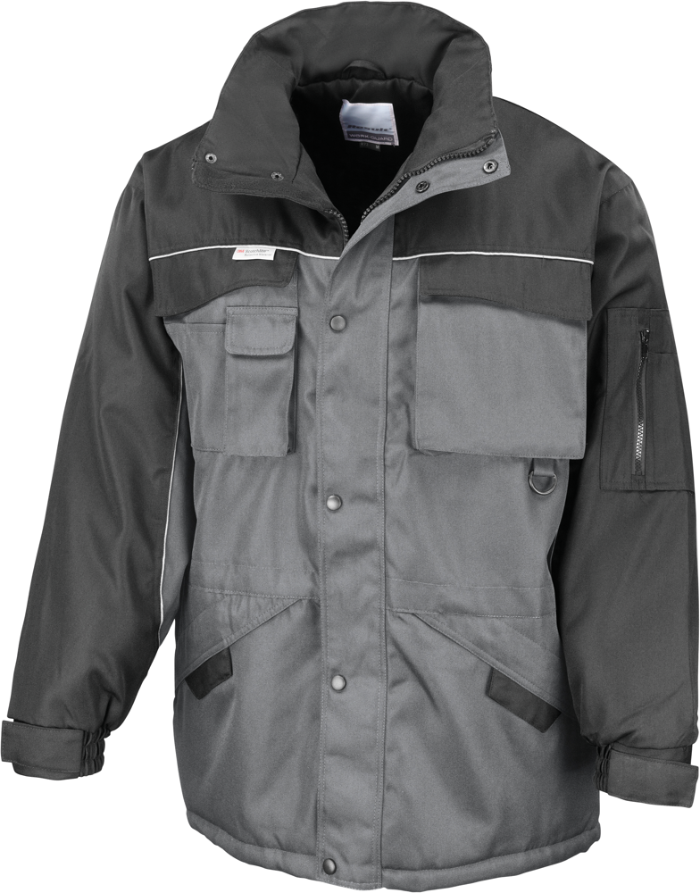 Buitenkant: 600D heavy duty oxford Taslon met PU coating. Wattering: 100% polyester 160 gram. Binnenvoering: bovenkant 100% polyester fleece en onderkant 100% 190T nylon taffeta. Versterkte naden. Kraag met fleece gevoerd. 3M™Scotchlite ™ reflecterende piping op de voor- en achterkant en op de mouwen. Volledige ritssluiting met stormoverslag met drukknopen. Lusjes voor headset. 2 opgezette zakken, 2 borstzakken met 3 penhouders en 2 sleutelringen (waarvan 1 veborgen) en GSM zak. 2 binnenzakken en een groot vak van mesh. Elastische mouwuiteinden en onderkant. Drukkersritsen.