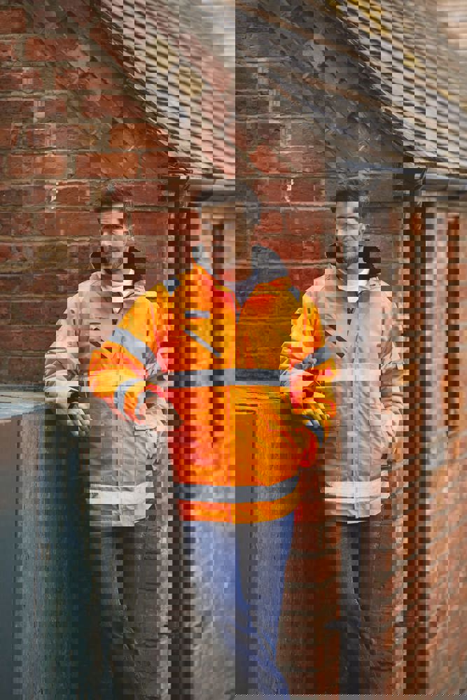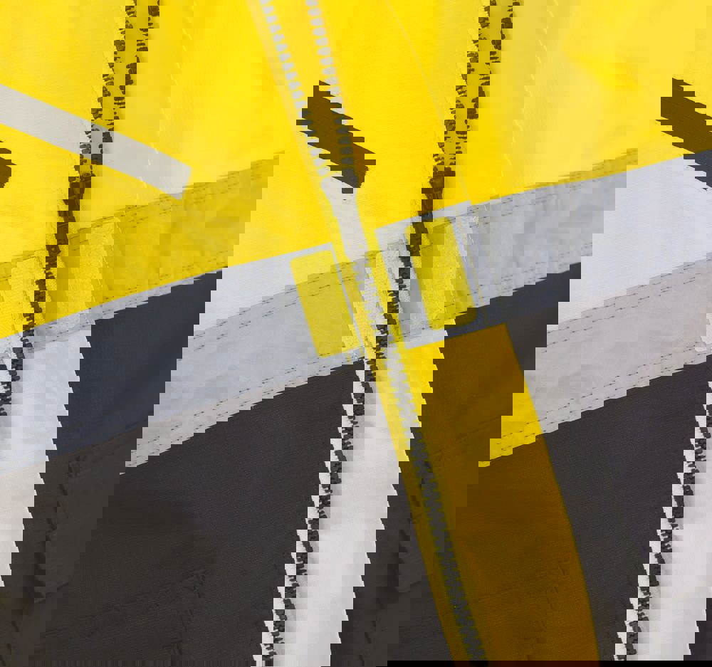 100% waterdicht ademend ripstop-polyester met kleine ruitjes. Afneembare onderlaag in velours. Reflecterende stroken (5 cm breed) met dubbel stiksel op het lichaam en armen en 2 reflecterende stroken bovenaan schouders. Kraag met velour en een ingewerkte, afneembare capuchon. Sterke rits met dubbele schuiver onder overslag met klittenbandsluiting. Buitenzakken met fleecevoering. Penzak en gsm-zak op linkermouw. Borstzak met waterdichte ritssluiting rechts en vak voor een identiteitskaart dat verborgen kan worden. Gesp om radio aan te hangen rechts op de borst. Optimale ruimte voor personalisatie op de borst rechts en drukkersrits. Conform aan EN ISO 20471 klasse 3, EN342:2004 inzake bescherming tegen kou en de norm inzake signalisatiekledij van de spoorwegen UK GO/RT 3279 Issue 8:2013 (enkel Hi-Vis Orange).