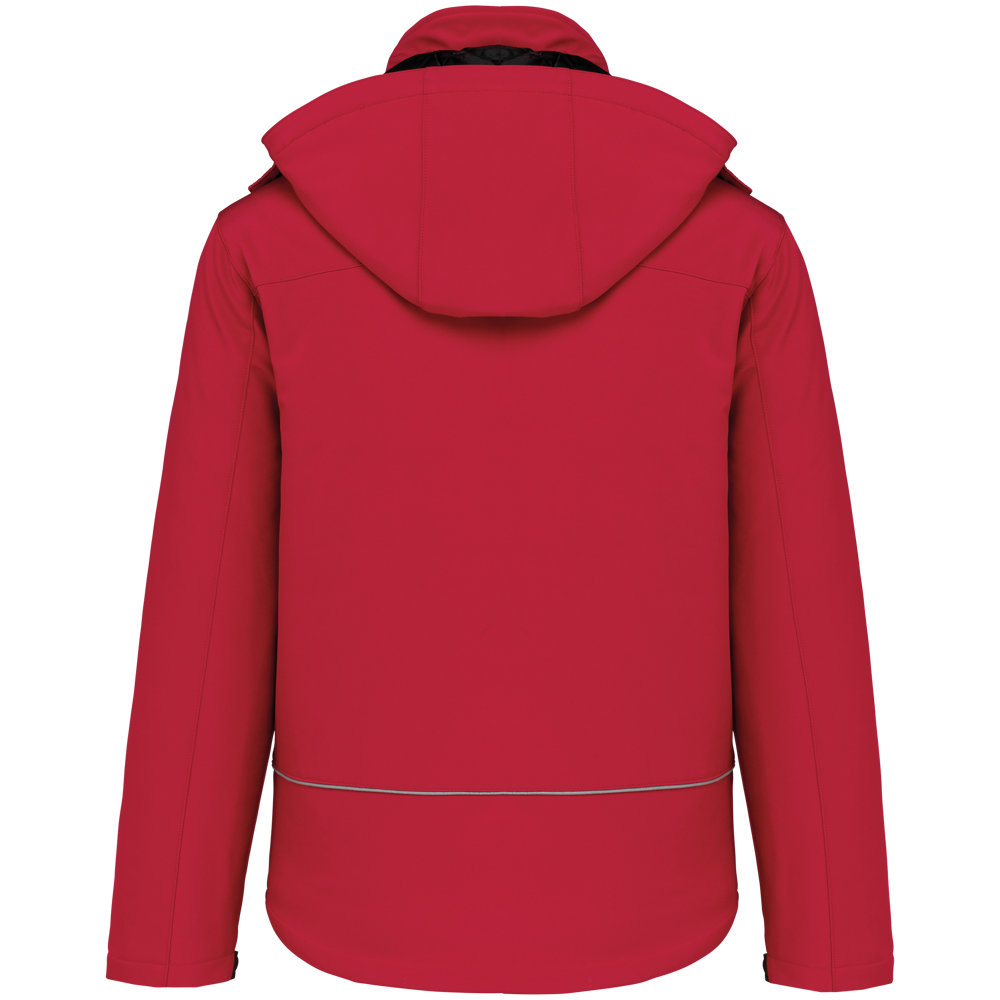 95% polyester / 5% elasthan. 3-laagse ademende stof 3000 g/m²/24 u en waterdicht 8000 mm. Buitenkant: 95% polyester / 5% elasthan. Tussenlaag: ademend membraan. Binnenlaag: microfleece. Gewatteerde voering van 100% polyester. Voorkant: 4 ritszakken (2 aan de zijkant, 1 op de mouw, 1 rechts op de borst). 2 binnenzakken met drukknoop. Afneembare capuchon met 3 gevoerde en gewatteerde panelen, regelbaar met stoppers. Met klittenband regelbare mouwuiteinden. 1 rits aan de linkerkant en 1 drukkersrits.