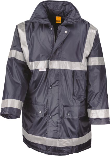 Buitenkant 100% 190T polyester StormDri met PVC coating. Gewatteerde voering van polyester 140 gram. Voering 190T polyester in ruitvorm. Waterdicht 1600mm en winddicht. Getapete naden. Capuchon met aanrijgkoordjes in de kraag. Volledige ritssluiting. Stormoverslag met drukknopen. 2 ruime zijzakken, 1 binnenzak en 1 zak voor gsm. 3M™ Scotchlite™ reflecterende banden 50mm genaaid. Drukkersrits.