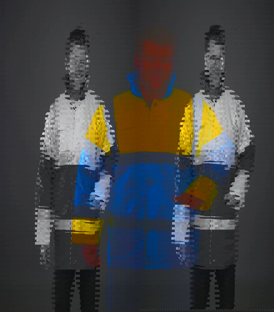 100% polyester. Windbreaker in contrasterende kleuren voor een verhoogde zichtbaarheid en veiligheid. Ideaal voor personeel op voetbalvelden, organisatoren van events, parkeerwachters, mensen die de brandveiligheid verzekeren, paramedisch personeel enz. Buitenstof van Oxford-polyester bekleed met PU met gewatteerde vulling. Zak voor gsm en walkietalkie. Twee zakken aan de voorkant en een veiligheidszakje binnenin. Conform aan de normen EN ISO 20471:2013 van klasse 1.