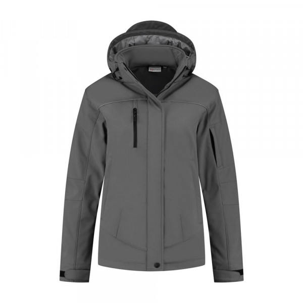 Softshell jacket, 94% polyester / 6% elastaan, 310 gr/m², 3-laags softshell, gewatteerd, ladies fit met opstaande kraag, mouw met klitteband verstelbare manchetten en windvanger aan binnenzijde manchet, 2 steekzakken, borstzak en mouwzakje met YKK rits, winddicht, ademend, waterafstotend, binnenzak met rits, afneembare capuchon, reflectie piping op borst en rug, printersrits aan binnenzijde en verstelbare onderzijde middels koord/stopper.