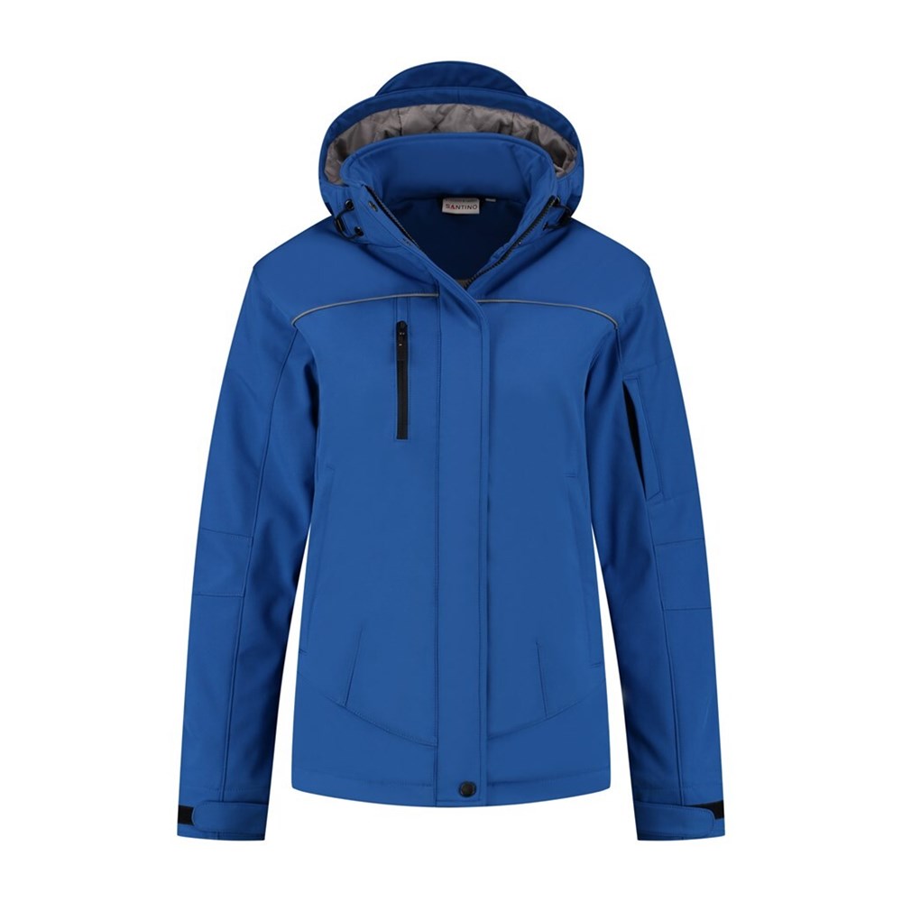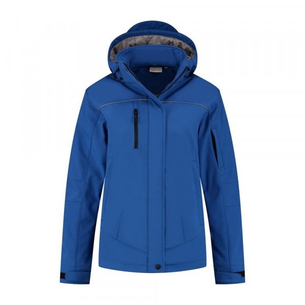 Softshell jacket, 94% polyester / 6% elastaan, 310 gr/m², 3-laags softshell, gewatteerd, ladies fit met opstaande kraag, mouw met klitteband verstelbare manchetten en windvanger aan binnenzijde manchet, 2 steekzakken, borstzak en mouwzakje met YKK rits, winddicht, ademend, waterafstotend, binnenzak met rits, afneembare capuchon, reflectie piping op borst en rug, printersrits aan binnenzijde en verstelbare onderzijde middels koord/stopper.