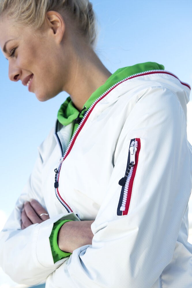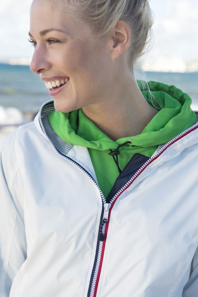 Opvallende, lichtgewicht jas met rits die tot en met de capuchon dicht kan. De jas is uitgerust met opvallende contrasterende strepen die langs de rits lopen voor een unieke, opvallende uitstraling. De jas is gemaakt van hoogwaardig ripstop polyester met PU coating ter bescherming bij regenachtig weer. De jas is gemakkelijk te veredelen dankzij de drukkersrits aan de binnenzijde.