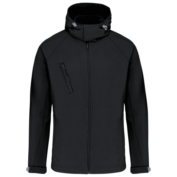 Stof in 3 lagen op elkaar geklit. Ademend 1000 g/m²/24h en 5000 mm waterdicht. Buitenkant: 95% polyester en 5% elasthan. Tussenlaag: ademend ventilerend membraan. Binnenkant: anti-pluis polyester. Raglan mouwen. Ritssluiting. 2 voorzakken met rits. 1 borstzak rechts met rits. Afneembare capuchon met aanrijgkoord en klittenbandsluiting. Klittenbandsluiting aan de mouwuiteinden. Verborgen drukkersrits op borsthoogte. Raglan mouwen.